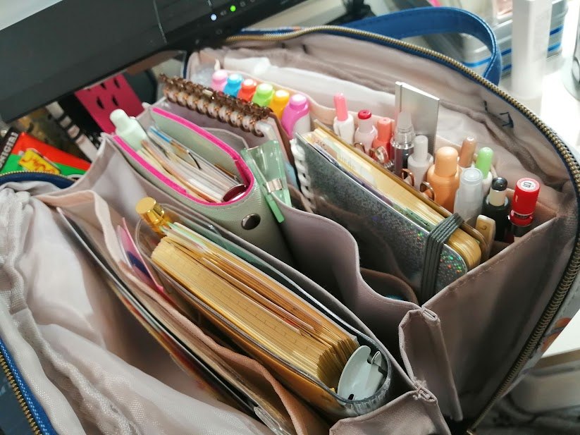 これらを持ち歩き可能にしたのは、宝島社で出していた「手帳タイムを愉しむ文具ポーチ」です。手帳タイムに必要なものがこれにすべて入るので助かっています。