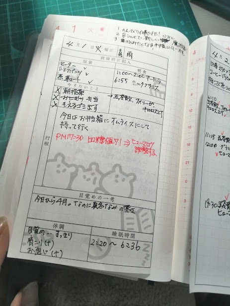毎日記録するものなので、なるだけあれこれ書き込むのではなく、簡単に記録できるスタイルにしています。メモするのは月に一度のふりかえりだけ。