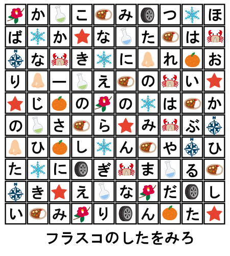 実際にフラスコ(緑と青の液体が入っている)のイラストの下の文字を、上から読むと「かにのひだり」と読める。 そういえばイラストにカニ、いるよね。