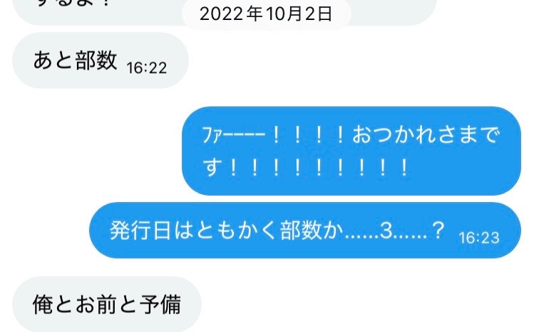 入稿は腕が4本あるオタクに任せ、私は通販を担当した。さすがに3部以上作ったが、死ぬまでには完売するかな〜と思いながらBOOTHを開いた。結果、ひと月で完売することとなる。おいおいみんな最霊好きなのか????どこにいたんだよ最霊の民は。