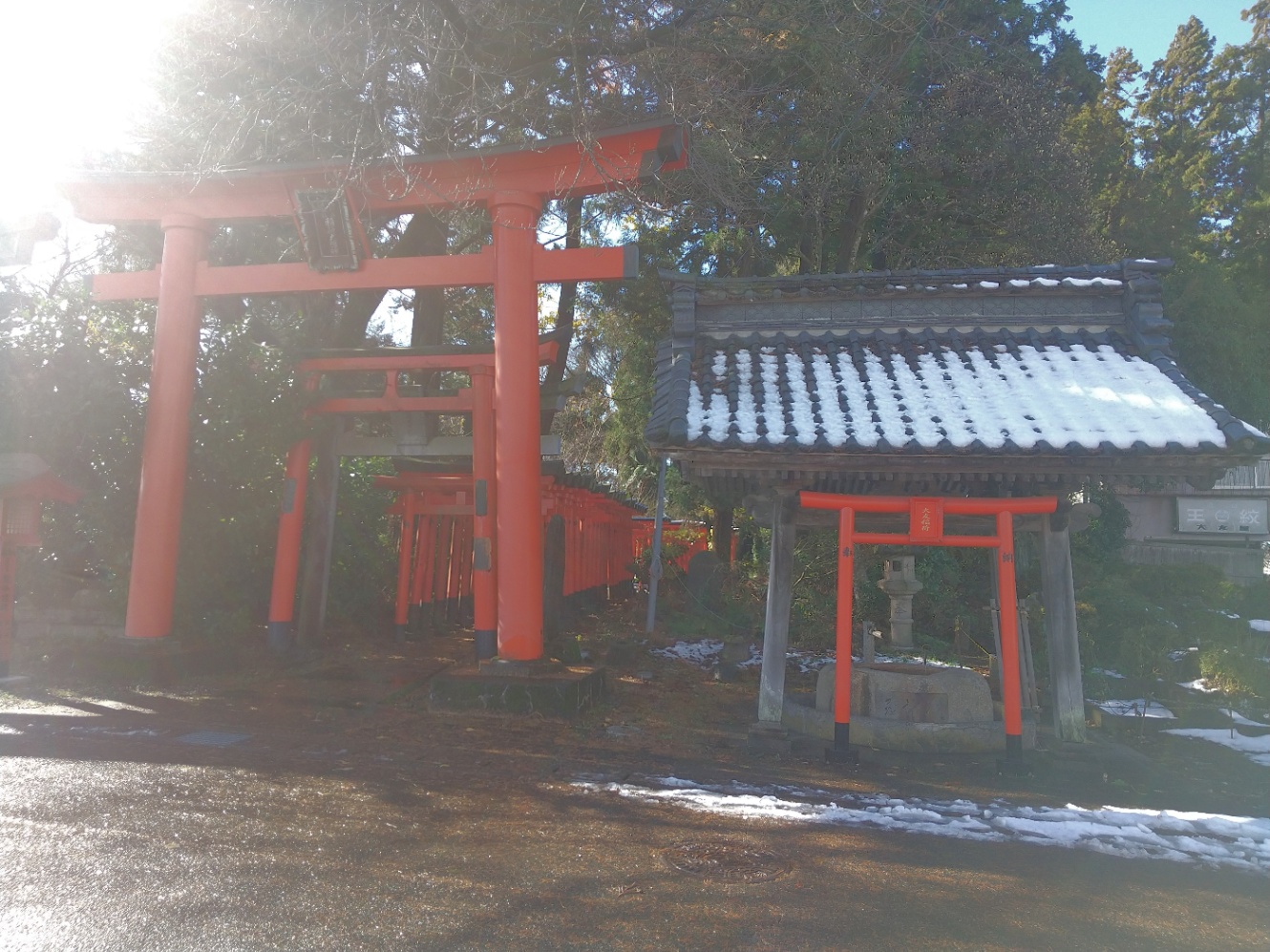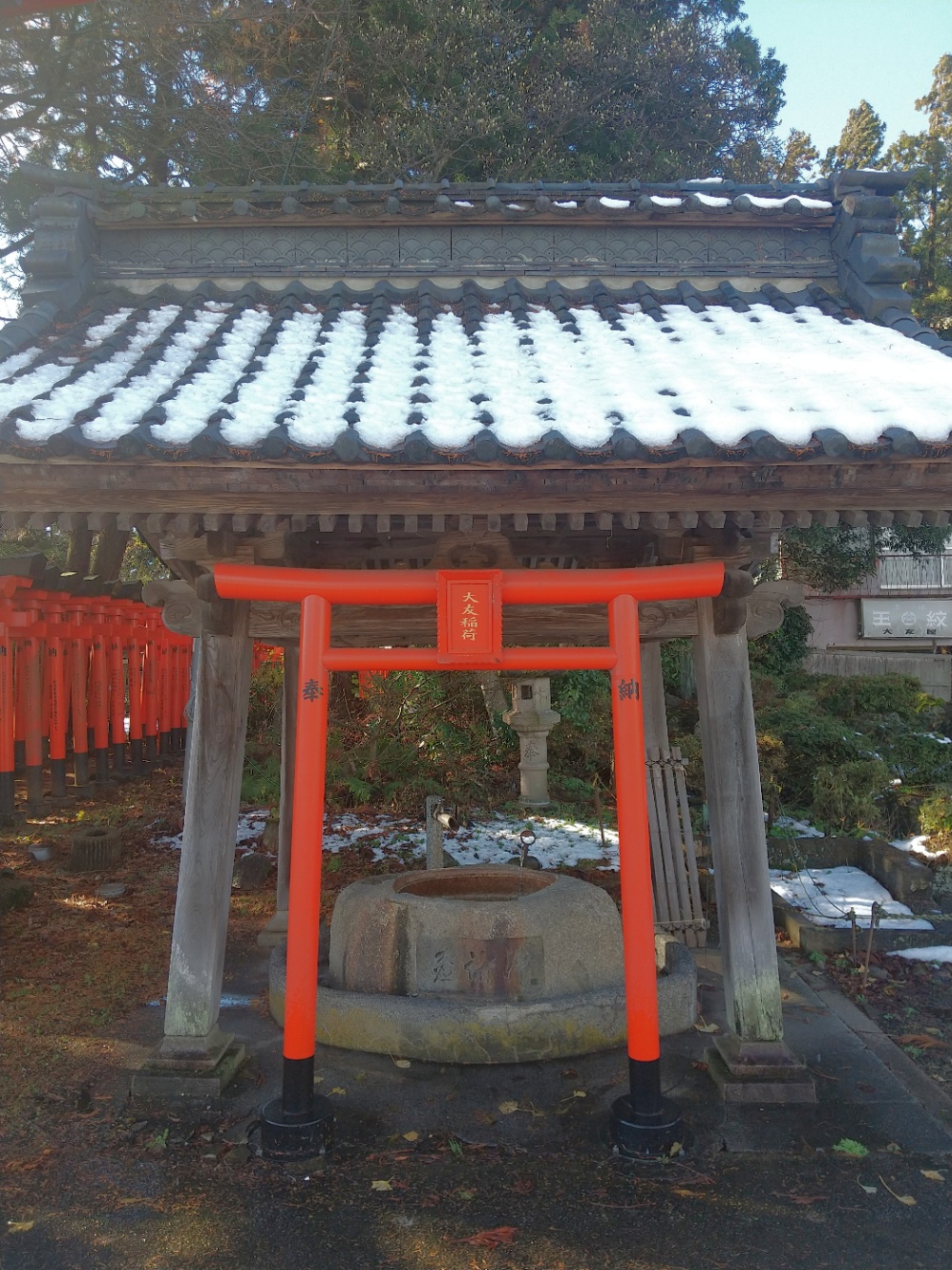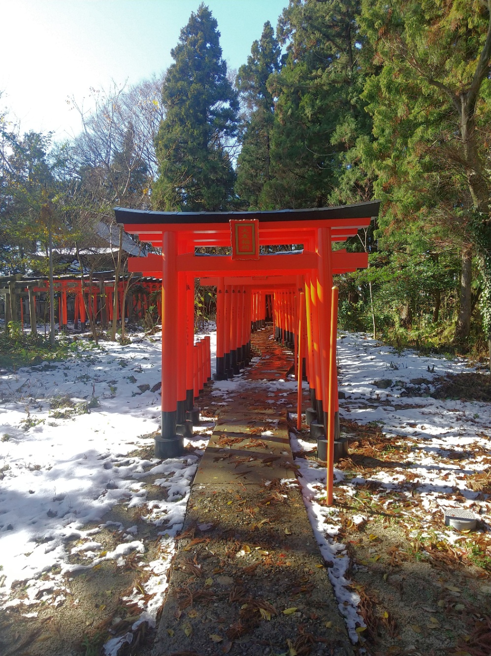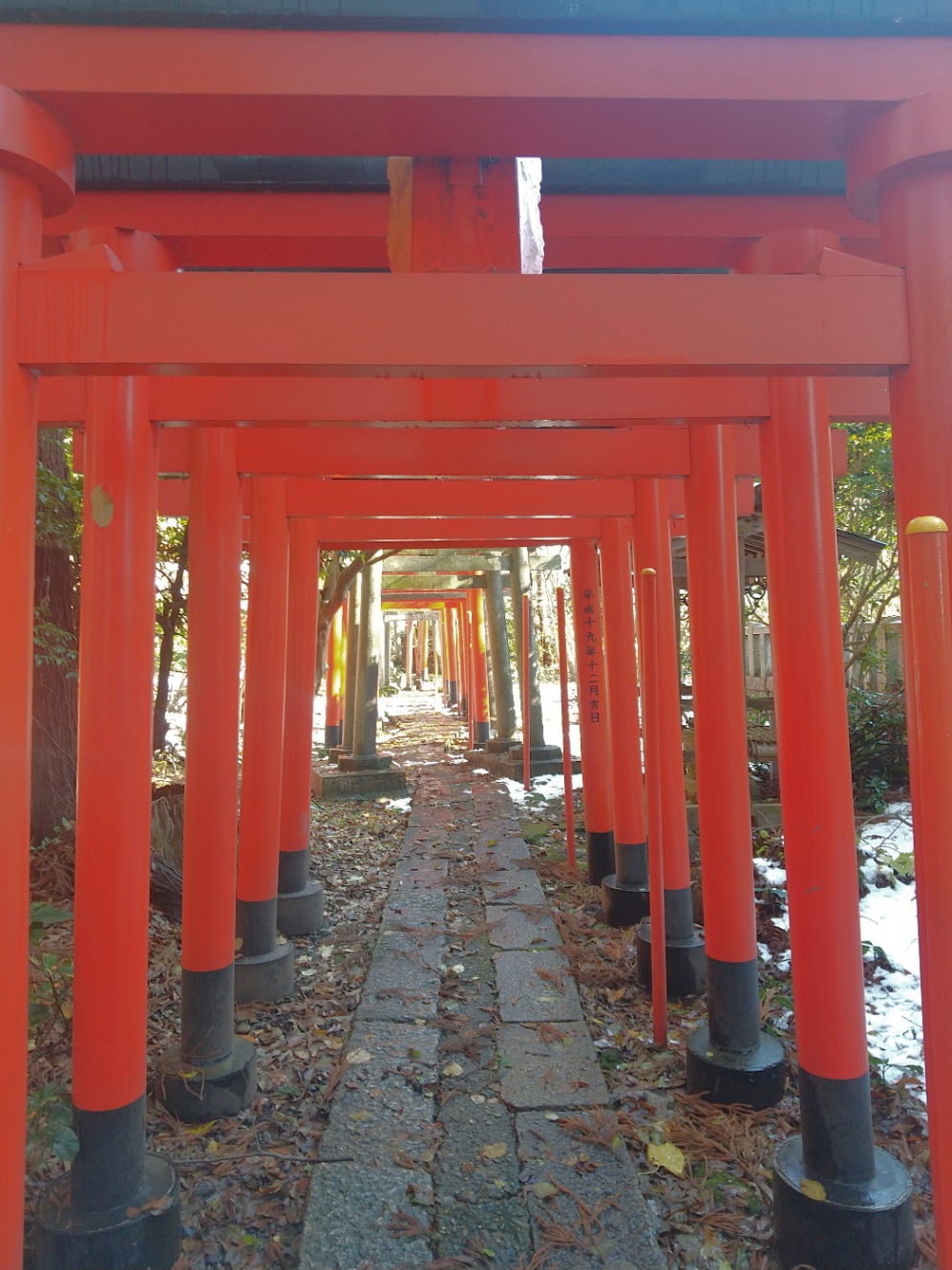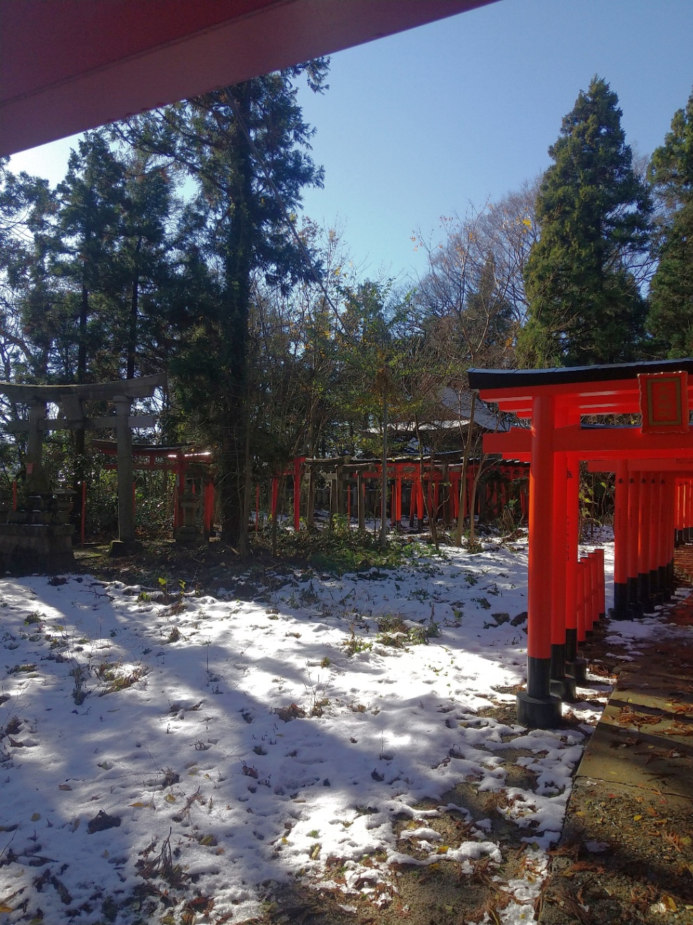 鳥居に積もった雪が融けて水滴がぼたぼた落ちてきた
