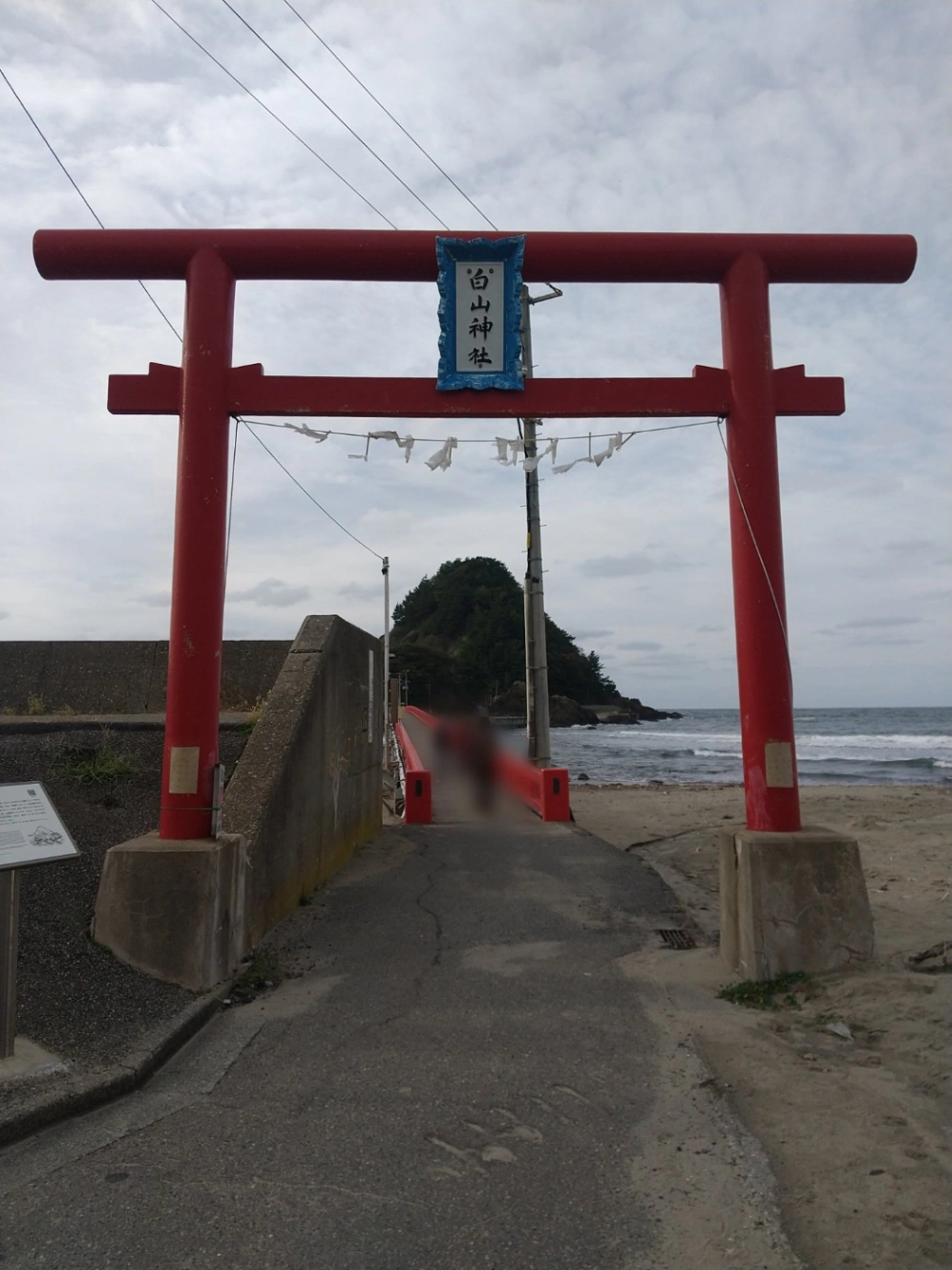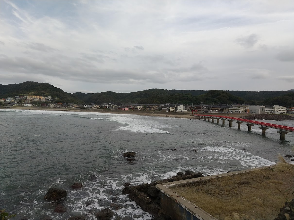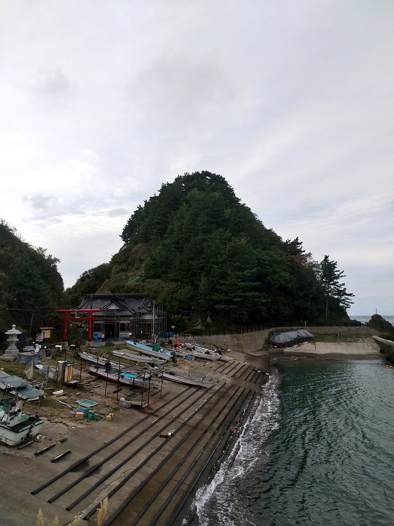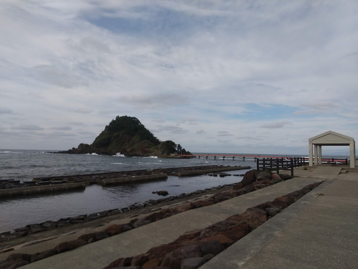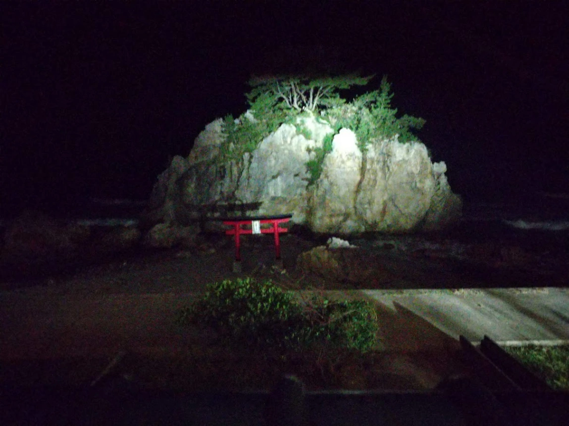 あいにくの曇天により夕陽はあまり見えず… 露天風呂は鳥居の岩場のほぼ真上なので身を乗り出すと丸見えだろうなって感じ