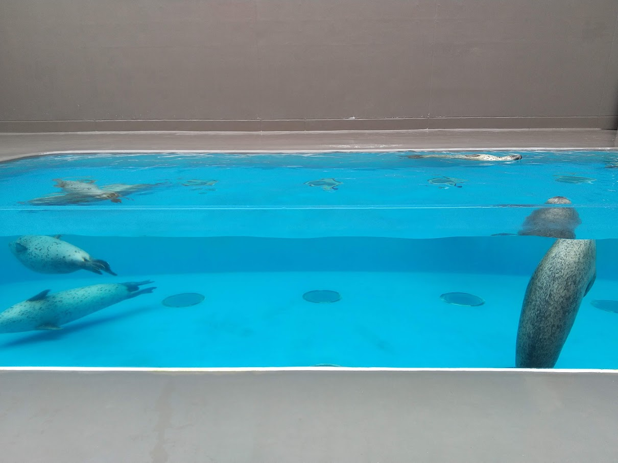 ショー待機中のアザラシたち 右の子ずっと縦になってて可愛い