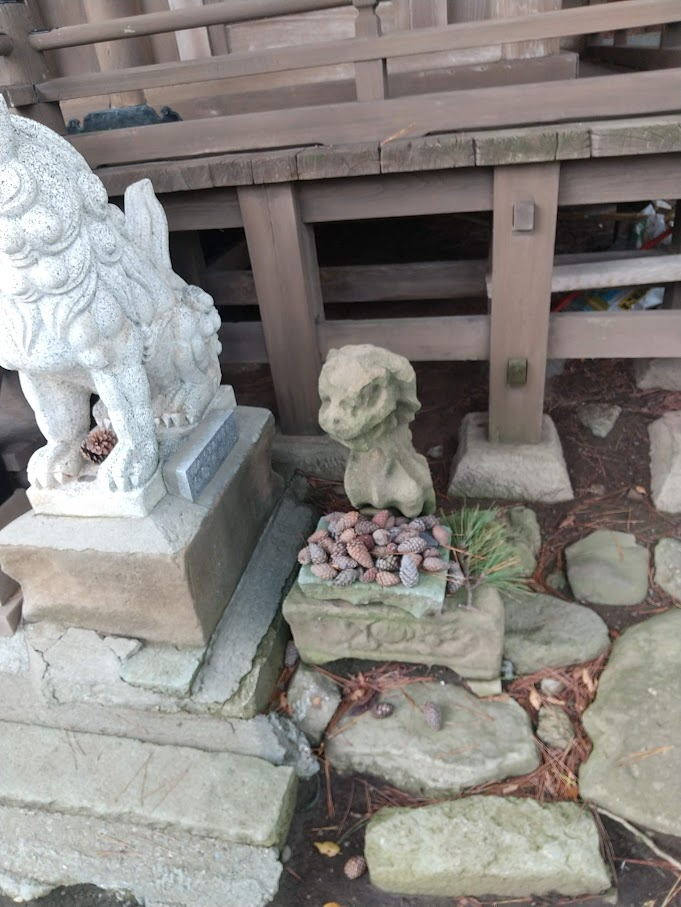 ちいさい狛犬に松ぼっくりがお供えされていた