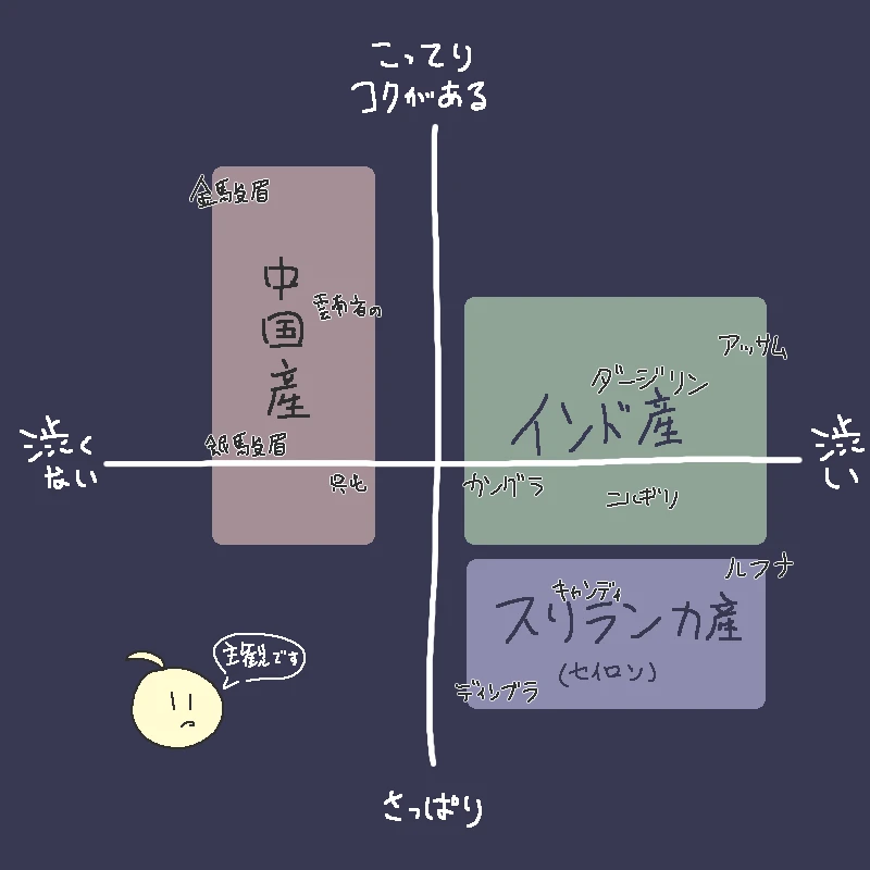 このグラフには致命的な抜けがあって、香りの軸がないこと。セイロンティーよりインド紅茶のほうが圧倒的に香り高いし、インド紅茶と中国紅茶は香りのベクトルそのものが違う。ただ、視覚的にそれを表現するのがむずかしくて……。