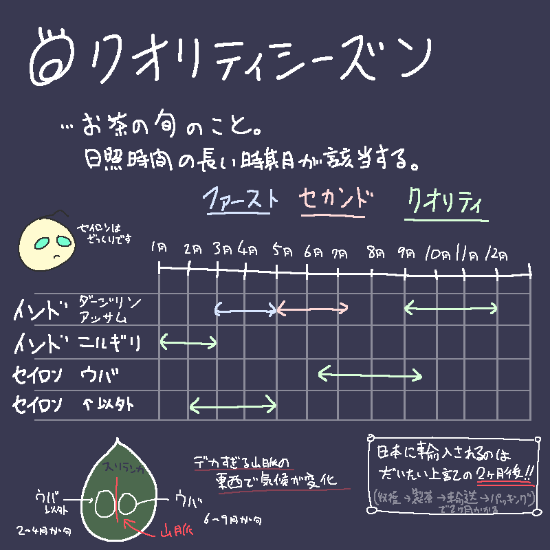 まず覚えておきたいのは、紅茶の味は①産地と②収穫時期とでだいたい決まるということ。