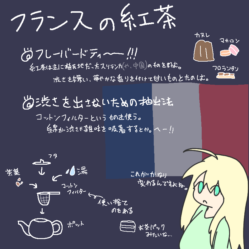 フランスは香りをつけたスリランカの紅茶。フレーバードティー。マカロンやカヌレのような甘いものと香りのいい紅茶を楽しむティーサロンの文化