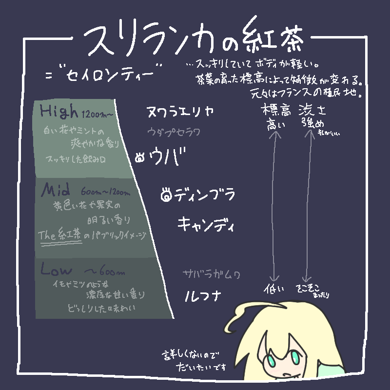 ぶっちゃけ私はセイロンティーに詳しくない。しかし飲めばすぐにわかる特徴として、全体的に味わいがスッキリしている。インドは重いがセイロンは軽い。