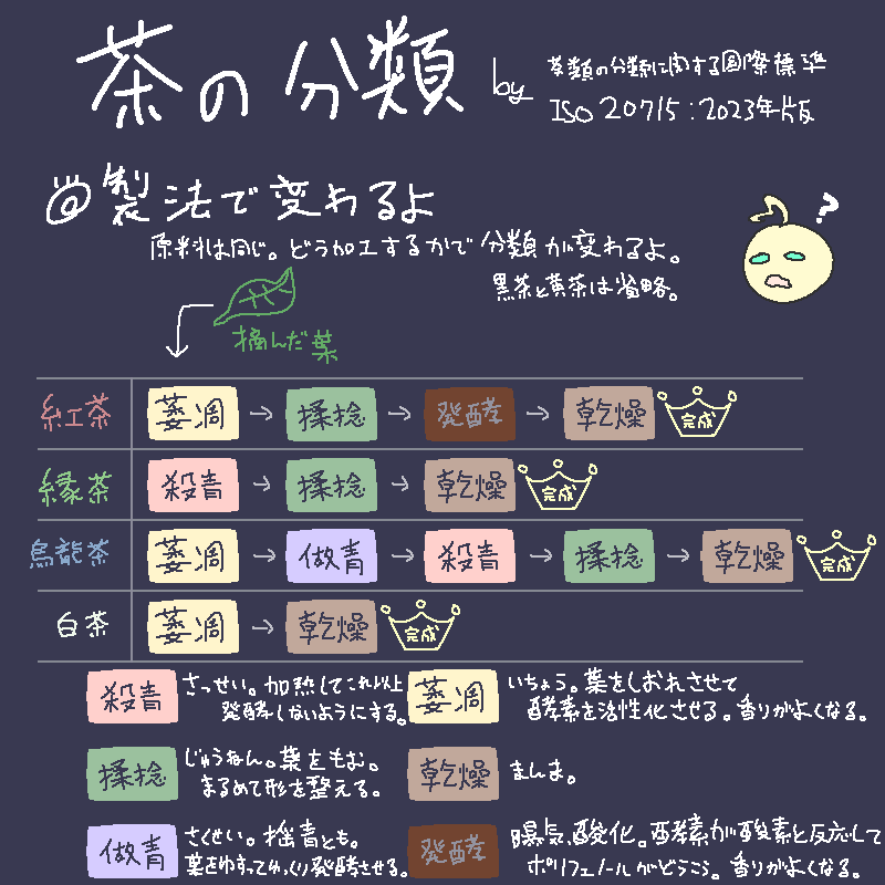 以下の画像はISO 20715:2023 茶類の分類について、に基づく。