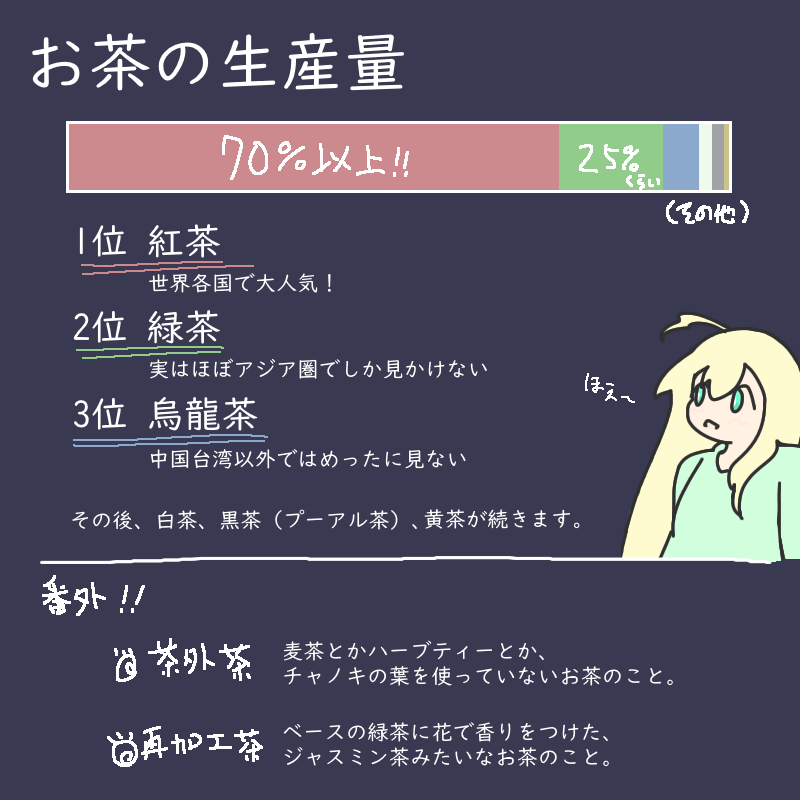 そもそも紅茶以外ってアジアでしか作られてないし! 緑茶は9割が中国と日本とで、烏龍茶はほぼ中国と台湾とで、白黒黄茶に至ってはほぼ中国でしか生産されていないし!!