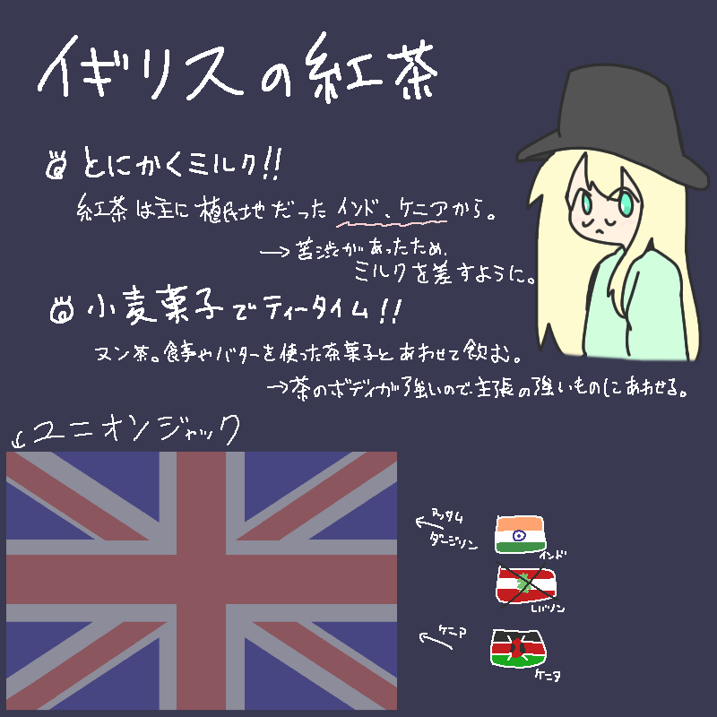 イギリスはインド(ダージリン、アッサム)とケニアの紅茶。ミルクティー、アールグレイ。ヌン茶をはじめとしたカパカパたくさん飲むティータイムの文化