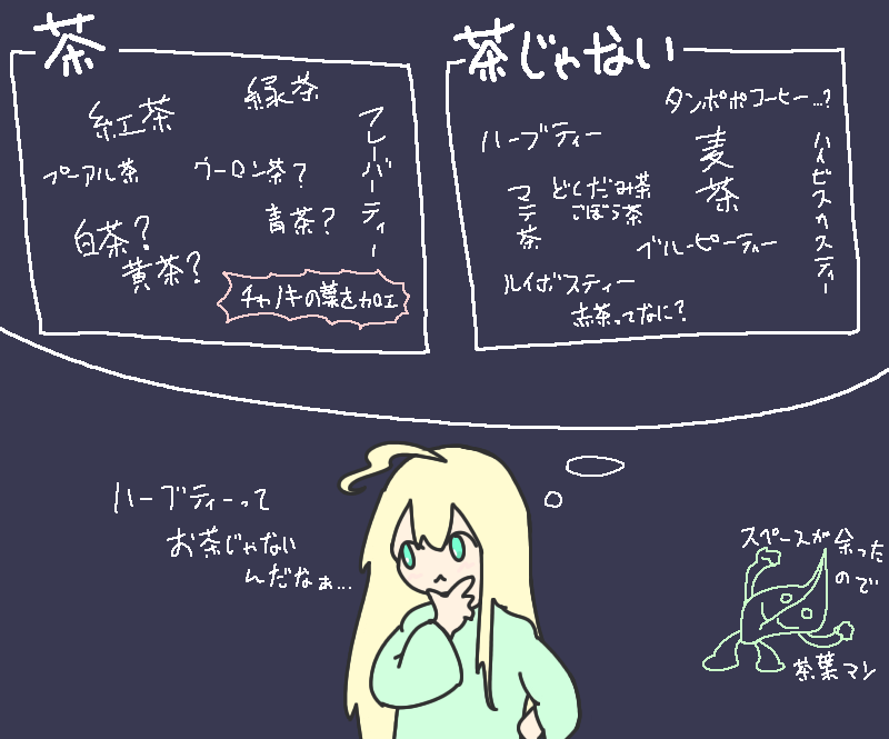 つまり、麦茶やルイボスティーなんかは厳密にはお茶ではない。チャノキの葉を使っていないから。こういった「お茶として服用されているけどチャノキの葉を使っていない飲料」は「茶外茶」に分類される。