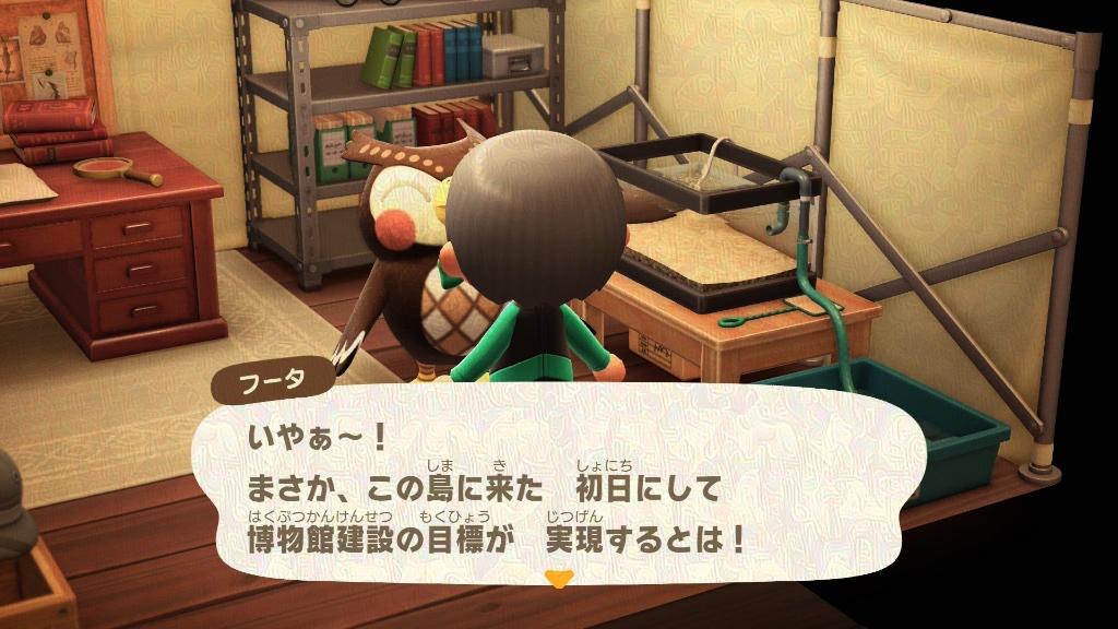 二日目(おそらく)高跳び棒入手とフータ来訪で資金集めついでに手に入れたさまざまな虫・魚・化石を持ち込みます。
