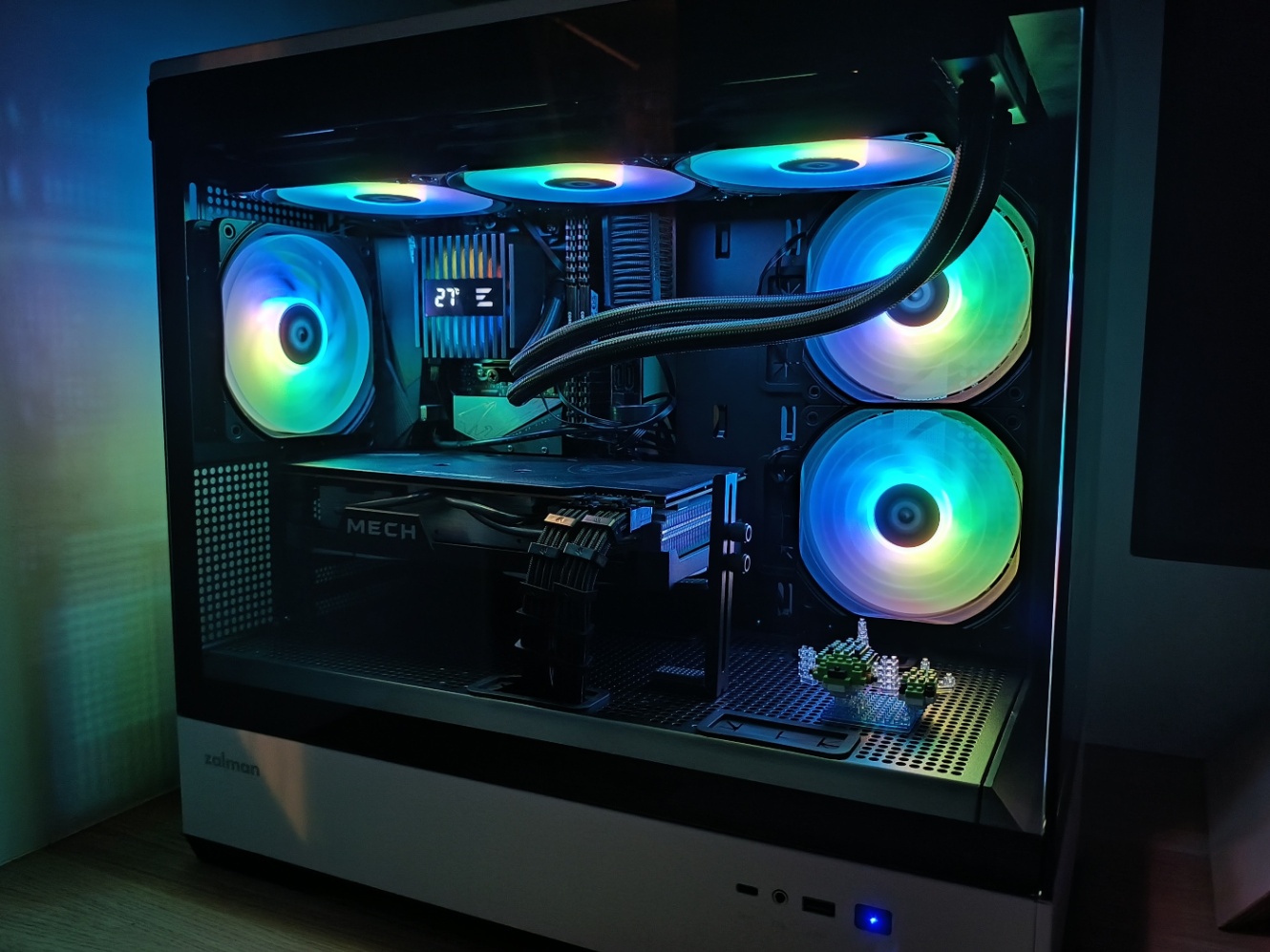 ケースファンとCPUクーラーを同じメーカーにしたので統一感を感じられている。ファンの配線はゴチャゴチャしているけど表から見えない場所に詰め込めているのでよし。ファンの制御はマザーボードメーカーのツール(GIGABYTE RGB FUSION2.0)でやってます。