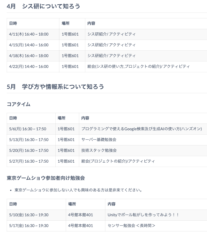 以下の画像はサークル内Wiki esa の中に書かれている2024年度勉強会の日程の一部です。