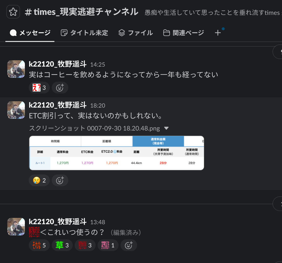 以下の画像はサークルでのTimesの様子です。サークルのTimesなので、技術寄りの内容は少なめで日常的なつぶやきが多めです。ですが、様々なリアクションを飛ばしてくれたり返信をもらえることでその人の趣味や関心を細かく感じられるため人とのつながりをより一層つくれたと思います。