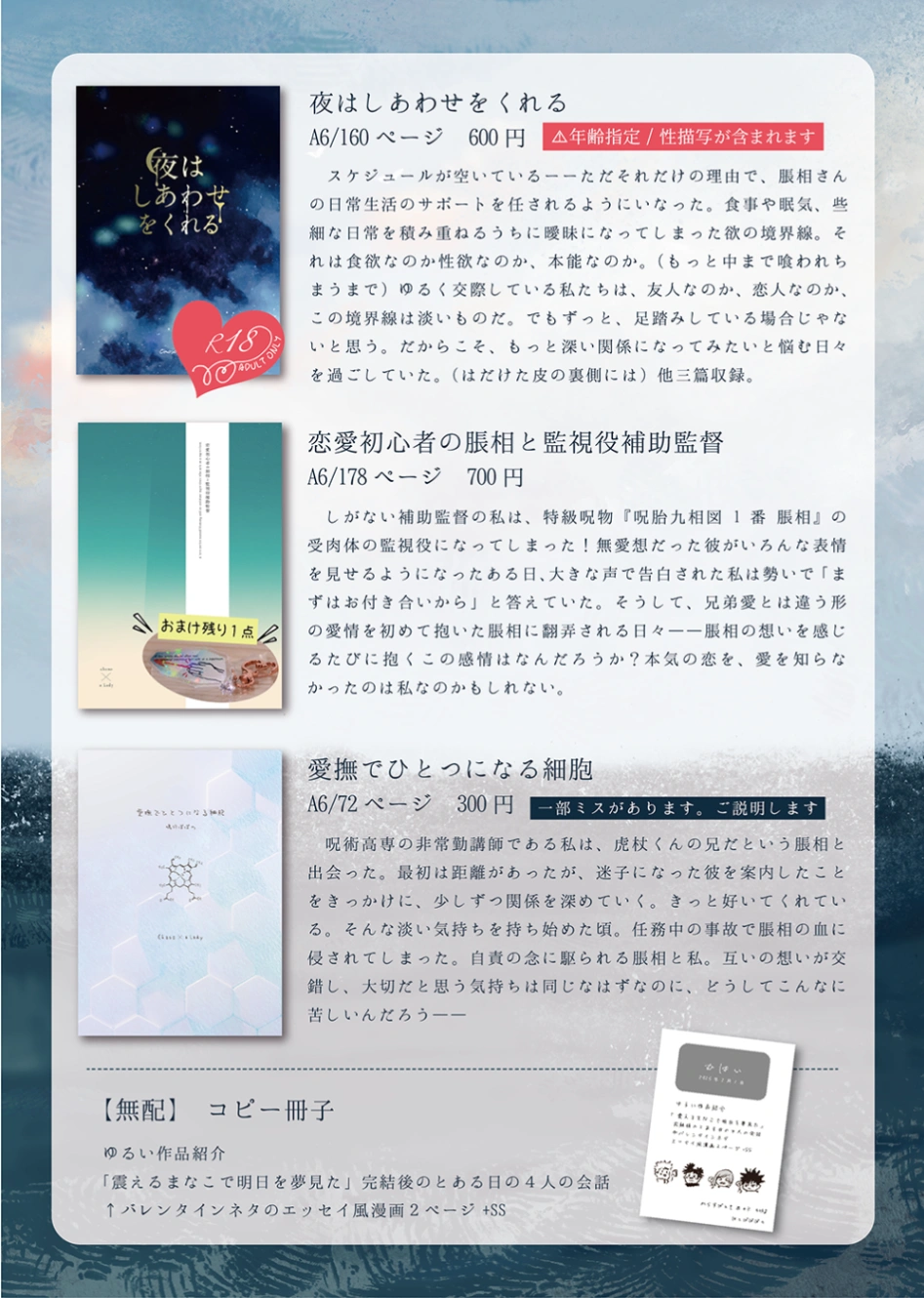 あと、恋愛初心者の脹相と監視役補助監督の初版をこちらのURL開放と同時に追納することにしました。アクリルキーホルダーはもうつかないのですが、本がほしい方はついでに注文できます。