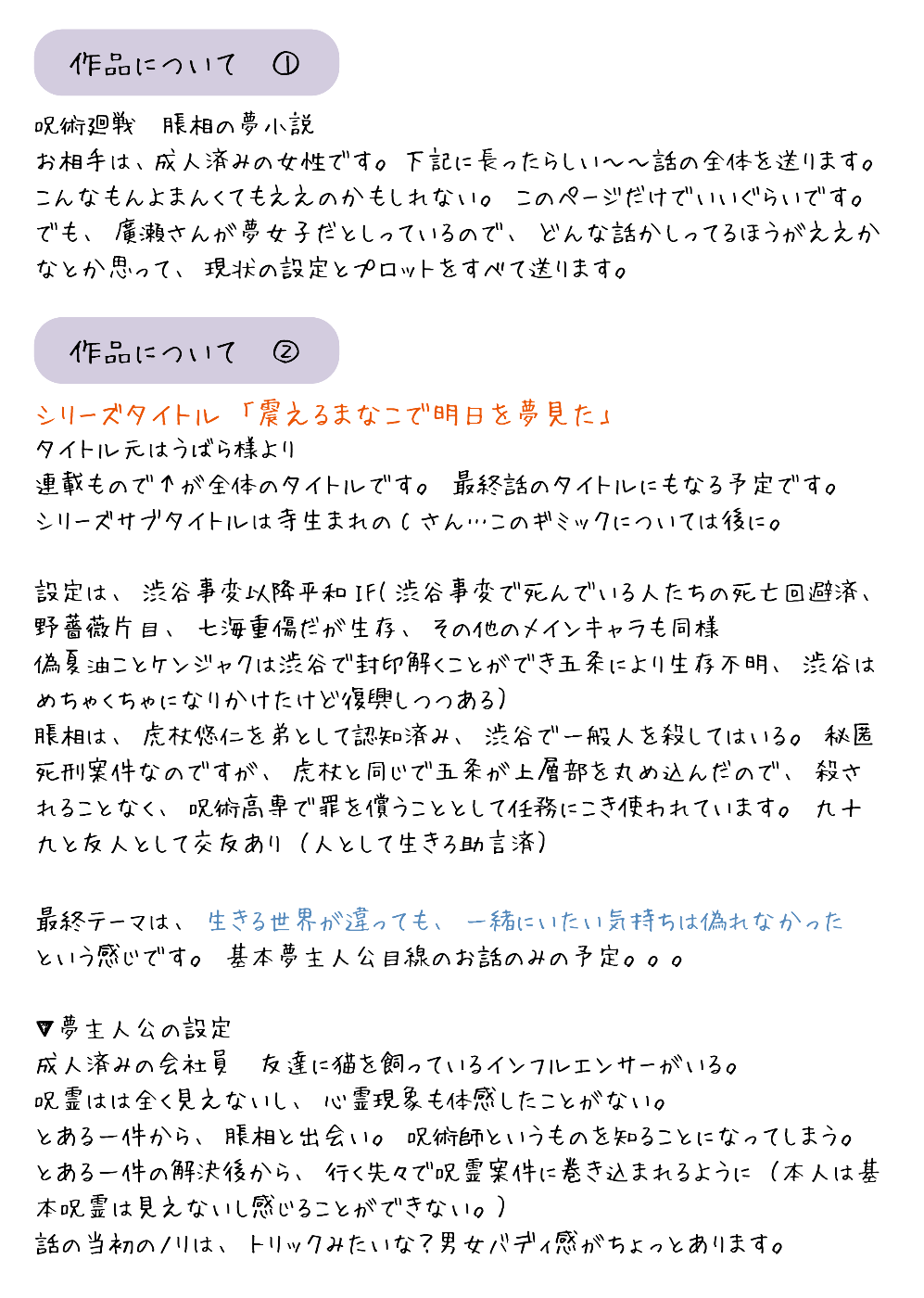 私が脳内の書きたいもの→プロット として頭の中にあるものを書き出したものです。廣瀬さんは仲良くしてくださっているフォロワーさんなので、喋り言葉でまとめています。