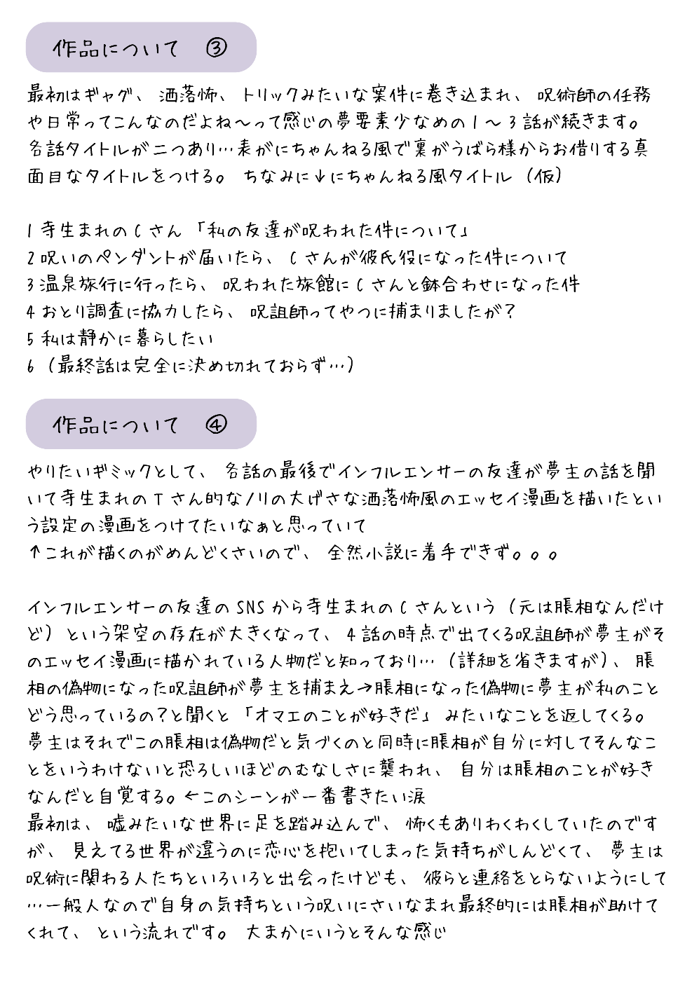 エッセイ漫画というギミック。私は真面目な絵を書けないけど、エッセイ漫画風ならばチャレンジできるのでは…架空のギャグっぽい漫画が話の軸に入り込んでくるのって仕掛けとして面白いのでは。脹相夢小説書いてる人でこういうことしている人いないんじゃ…オンリーワンなことやってみたいと初めました。