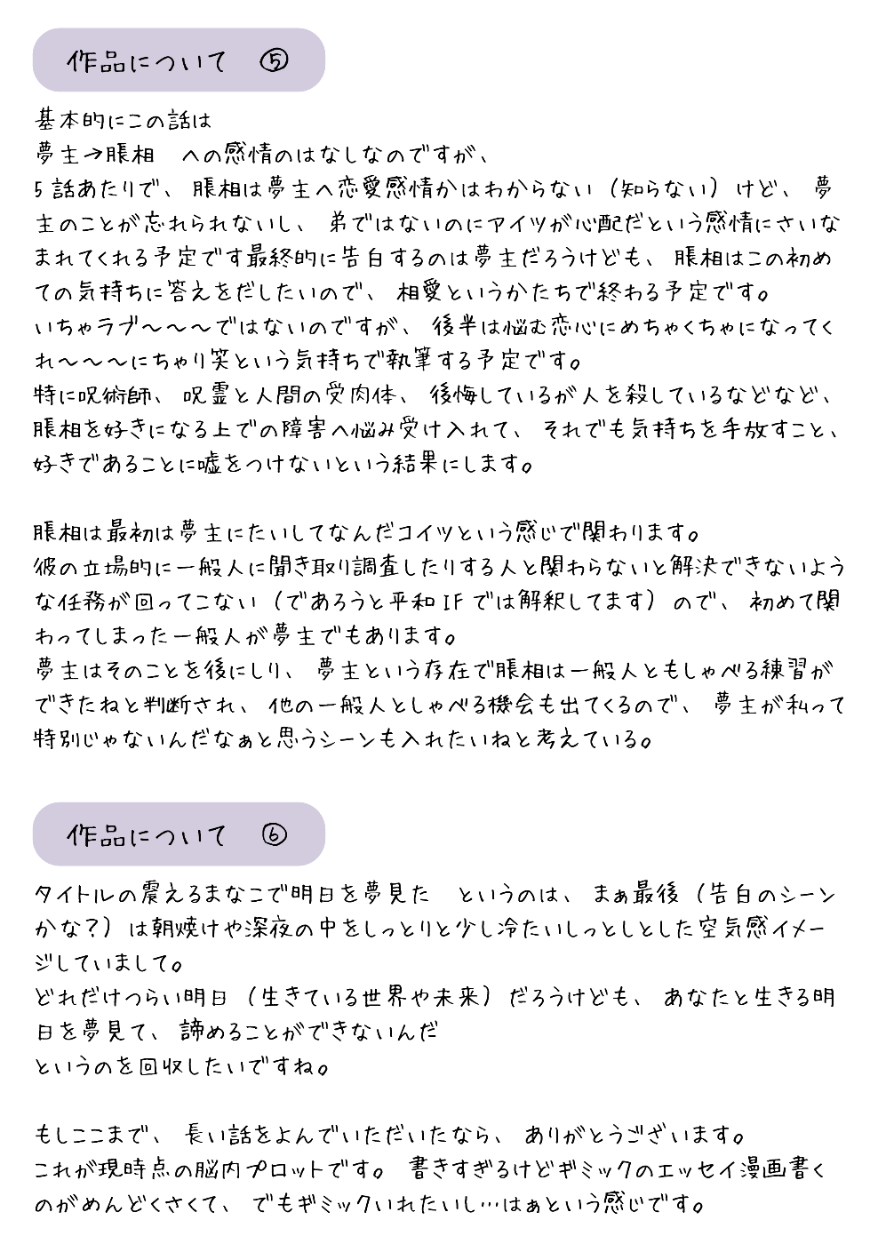 こちらのシリーズの最終話まで読んだ人向けで、尚且つ書いた人(私)の頭の中を見たいタイプの人向けの内容になります。