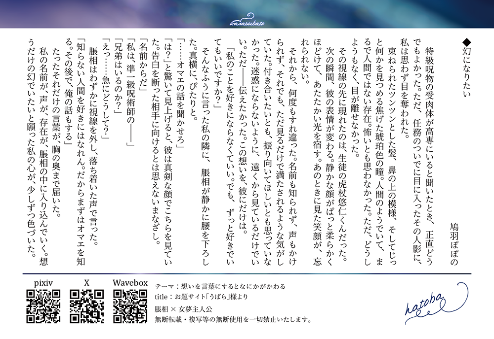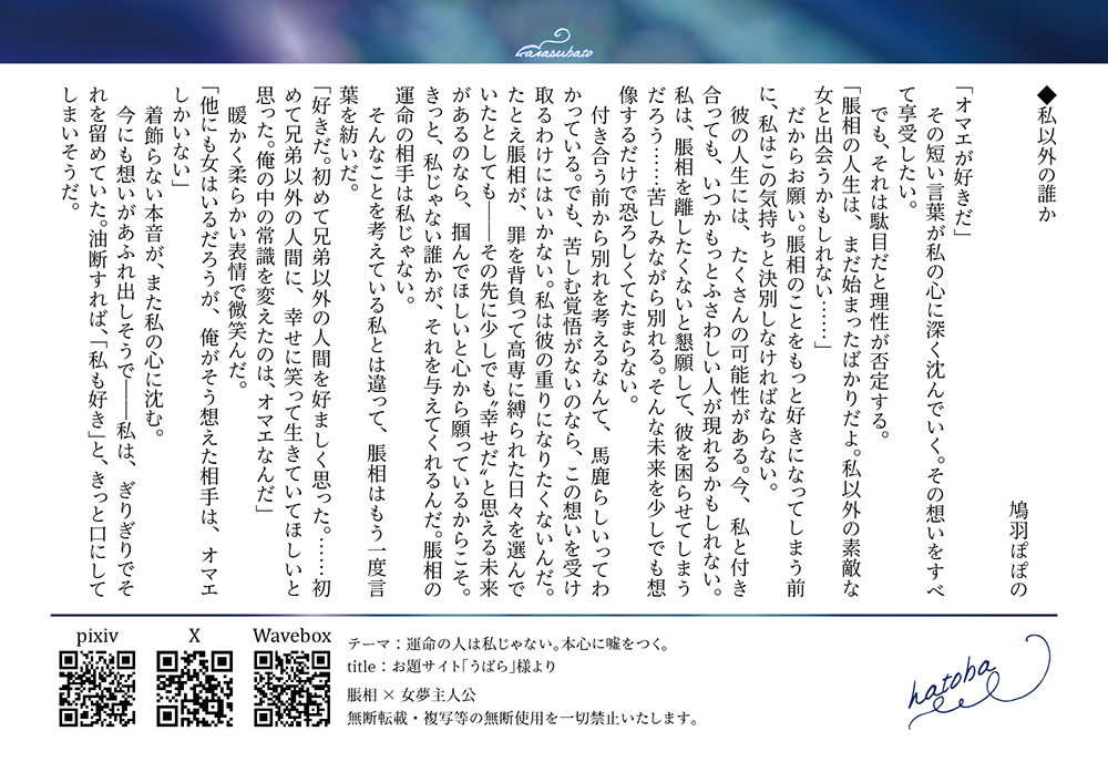 ↑『私以外の誰か』なんで夢主も好きなのに脹相の告白受けないんですか??なんですけど、書いた本人が、相手が大切で好きすぎるが故私よりもいい人がいるよと断る女とそれでも俺にはオマエしか居ないと諦めない男のシチュエーションが好きだからこんなん書いたんだ。