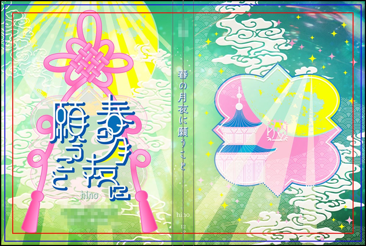作中の舞台設定は春のまだ寒い時期、その満月なので、冴えた月光を表すために用紙はアストロブライト レモンで、月だけ白押さえをかけないデータとしました。これ、別案として結び紐と背景色をぬいてアストロブライト ピンクを使う案もあったのですが、ピンクだとめくったときに表2.3がくどいかなという理由でやめています。イエローでも目が痛いので、どっちもどっちで変わりないのですが……
