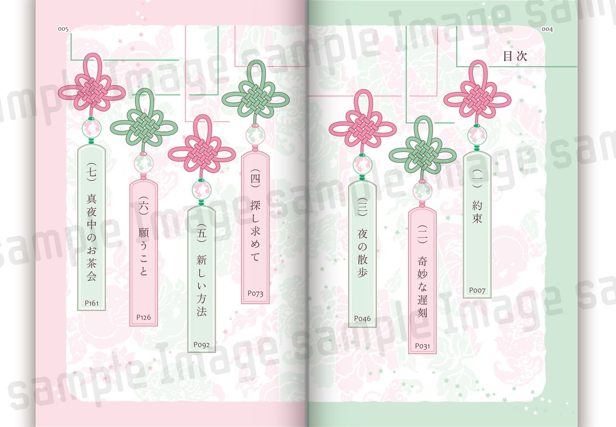 これは表紙が上下方向のグラデーションになっているので、色を合わせてグラデーションにして、目次の背景テクスチャにした文様(牡丹・ザクロ・蝙蝠・胡蝶)を使い、天(上辺)だけに満月の延長をぼかしで入れています。できあがりイメージ図が以下。
