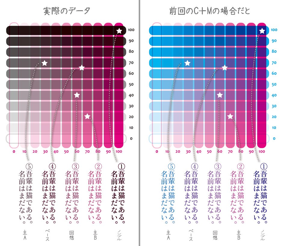 短歌集の時は、本文が36ページ&色使いがピンク*シアン(7月活動報告後半を参照)だったので、ベースをM+Cで組んだのです、イメージ的に分かりやすかったので(そこから印刷所仕様のM+BKデータになるよう色を置き換える作業は発生しました)。