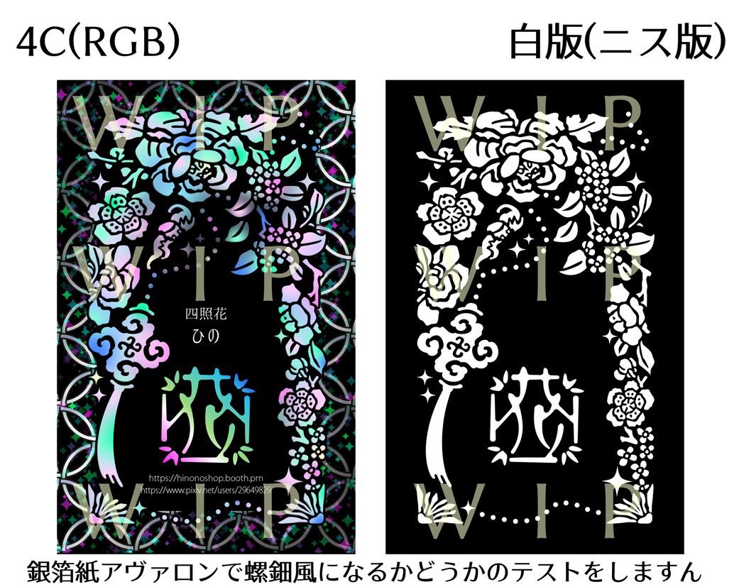 これを使って表紙を作ろうかな、と思っていたのだけど、おたさんはサイトで見られるサンプル画像のサイズ感が分からない。A6だと模様が大きすぎるのでは、と思って躊躇していたんだけど、思い切って試す機会ができた…と思い、テキトーデザインを錬成しました。パターンサイズは思っていたよりずっと小さかったので、A6表紙にもいけそうです。名刺サイズ55*91、A6は105*148、ヨコ2倍タテ1.5倍くらいなのでむしろこれくらいが一番いいサイズで収まるのでは。