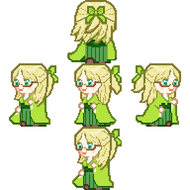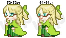 下のがもとの32pxバージョン。これを64pxにすると下のようになります。(ウディチップビューワというのを使います。動作の確認の他、下のようなgifアニメーションでの書き出しができます。詳しくはぴぽやさんのところで→ https://pipoya.net/sozai/tips/conversion-of-image-material-format_for_wodychip-viewer/)