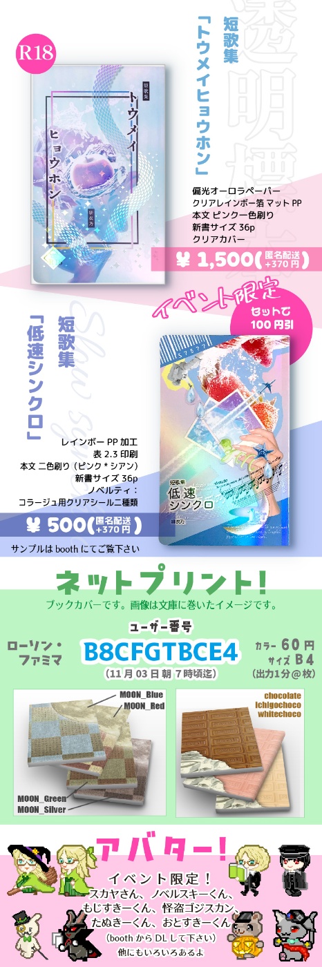 10月26日日曜日に、ピクリエでサーバーイベント「ノベフェスタ」が開かれました。初めてピクリエでのイベントへサークル参加するので、準備のあれこれに少し手間取りましたが、お品書きはフルマックスの2400pxを使い、いっぱい並べました!
