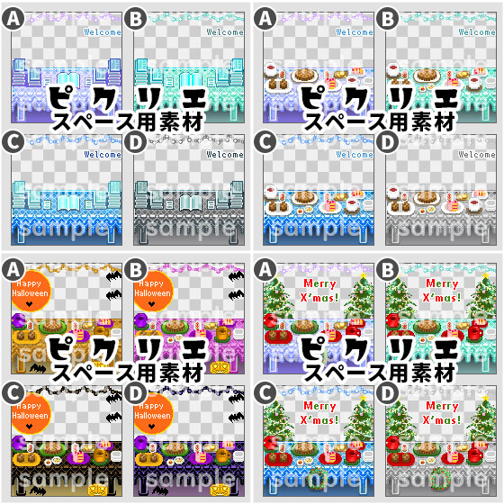 ちょうどそろそろハロウィンだし、クリスマス用の素材も作っておきたいなぁと思っていたので、それを念頭に、通年使えるものとして頒布スペース・お茶会スペースの2つを。合計4デザインでカラーバリエが各4。これまたなかなか頑張りましたね我ながら。