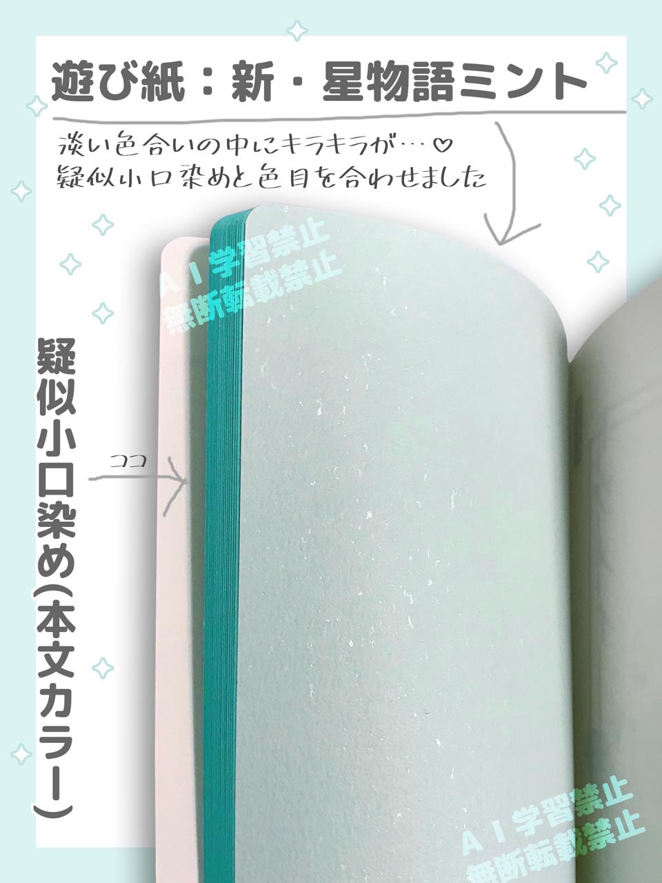 遊び紙も、加椎さんにキラキラ具合を教えていただいて即決めした、新・星物語ミントというキラキラする紙が狙いどおり擬似小口染めの本文カラーとピッタリ合って、とてもよかったので喜んでます。