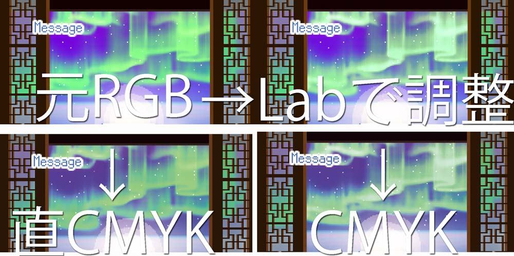 ためしに、フォトショでパッチ処理を組んで、RGB→CMYK変換をかけたところ、テストした300枚中だいたいの画像で色が極端におかしくなっている結果になりました。ぐはあ