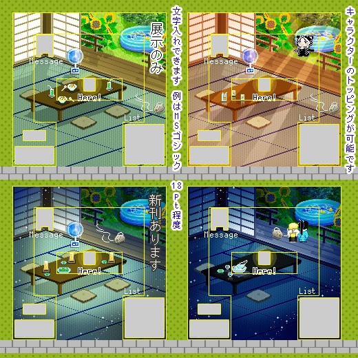 レイヤー数の多めなやつとして、夏のヒマワリの和室の、夜バージョンを。画像の右下ね。
