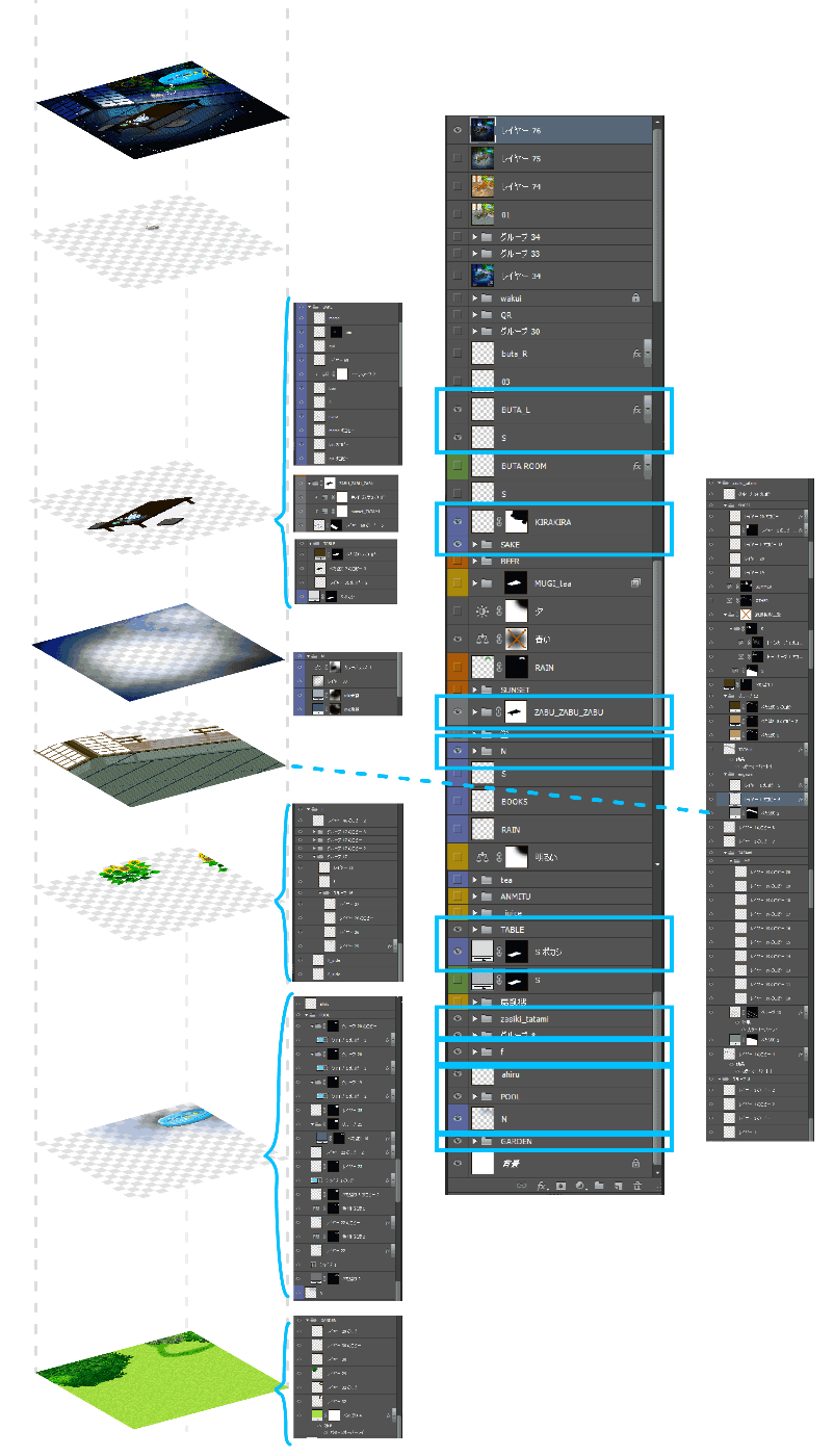 ドットベースの素材はベースを同じものから昼夜を色替えしてバリエーション作ったりするんですが、レイヤータワーがすごいことになってるよ!というのを少しだけ見せちゃいます。