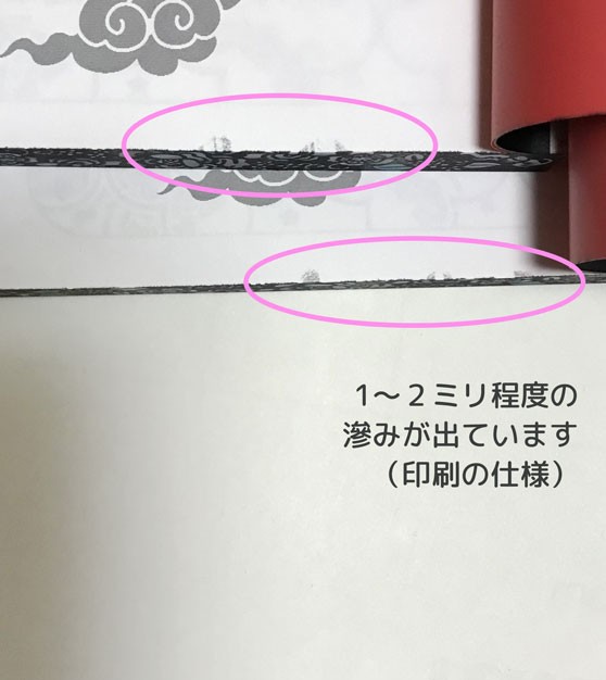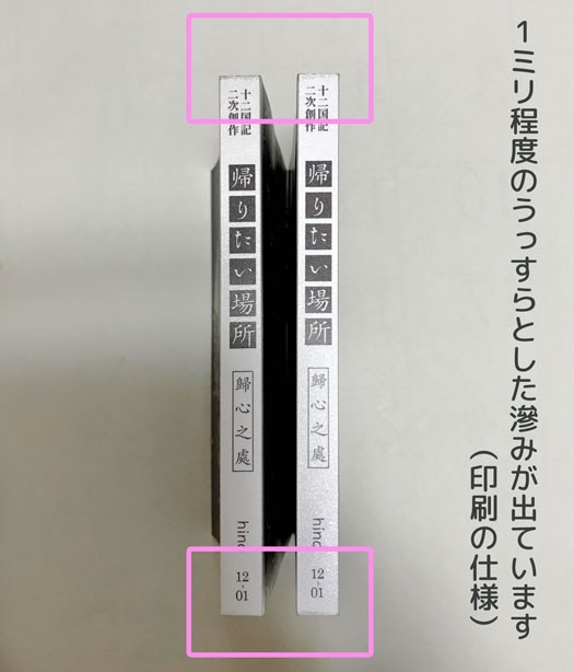 しかし仕様として書いてあったインクのしみこみ、やはり扉と奥付に少々インクが入り込んだ滲みが出ました。これはトレペを使ったから伝って染み込みやすかったとかはあるのかな(素人なのでわかんない)。背は、上下を断ち切りで同色帯を入れておけば目立たなかったはずなので、ここは次回以降(やるのか?)に気をつけたいところ。