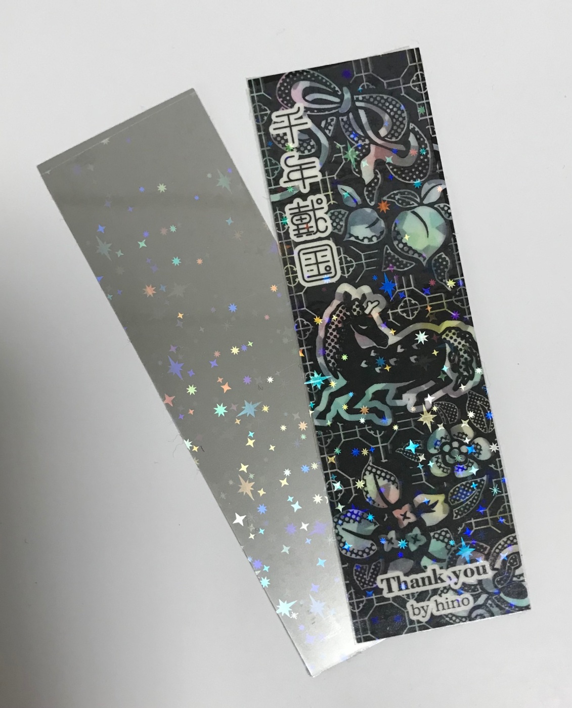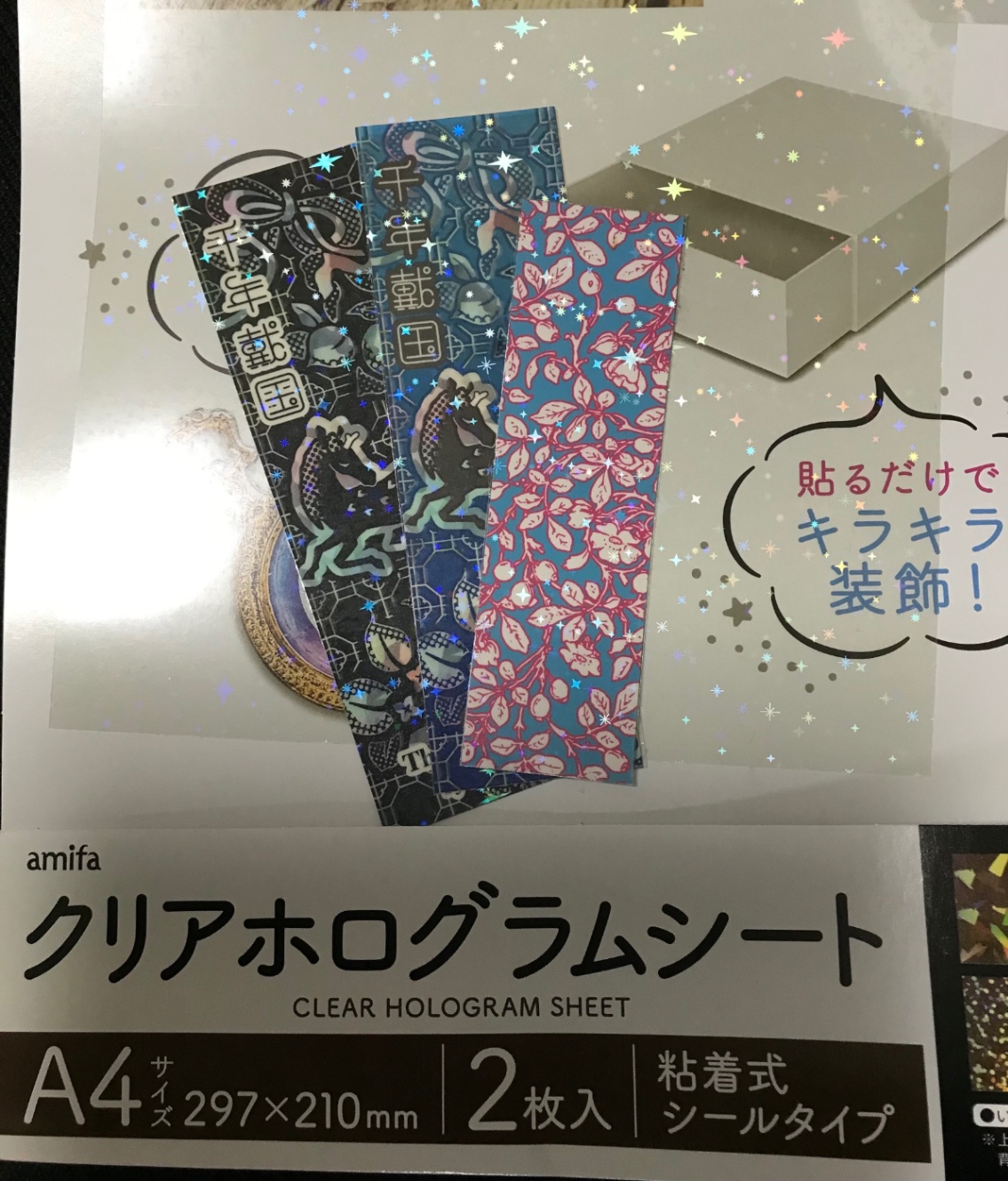 これを、しおりよりも一回り大きく切って、保護フィルムを貼る要領で空気が入らないように気をつけながら貼ります。このホロシートのパッケージ外袋を下敷きにすると、はみ出した部分が大方ひっついてもあとでビーッと剥がしやすいので便利でした。しおりがPP加工してあるので、そっちも多少ならビーッと剥がせるから、それも作業的にはとても楽でした。