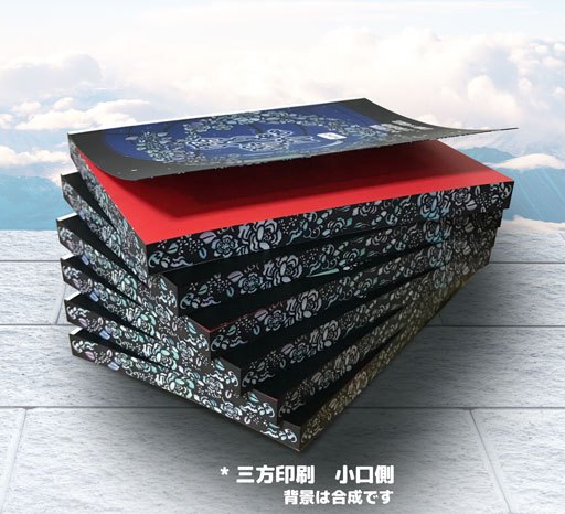 三方印刷、仕上がりはとてもきれい。螺鈿細工のイメージで、微妙なパステルのグラデを入れたのですが、偏らずに出ていました。よかった!