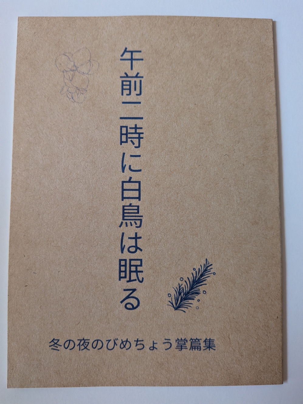 新刊はびめちょう掌編集『午前二時に白鳥は眠る』です。素敵なタイトルはフォロワーさんに考案いただきました! 表紙はクラフト紙印刷です。あえてのシンプルイズベストなデザインにしました。