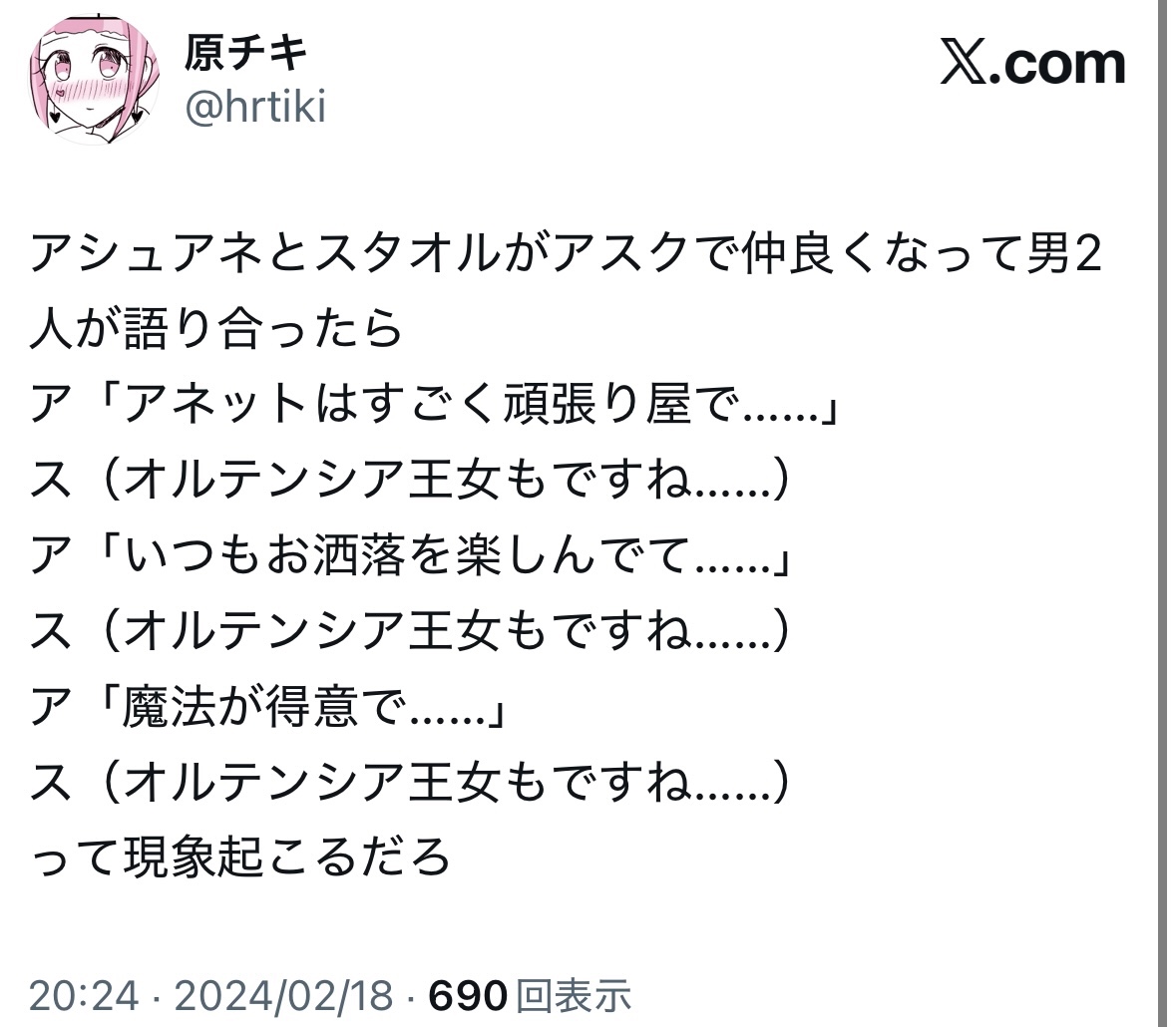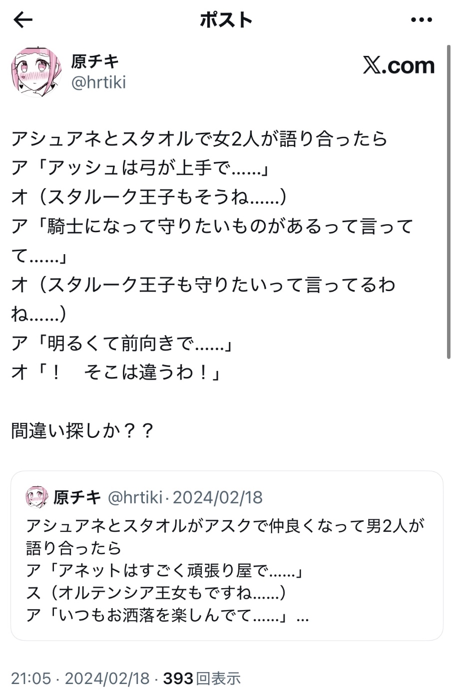 先に言いますが、アシュアネとスタオルはカップリングとしての2人の関係性は別物です。しかしなんかここ一緒だねってポイントが複数あるので今日はそれを語ります。