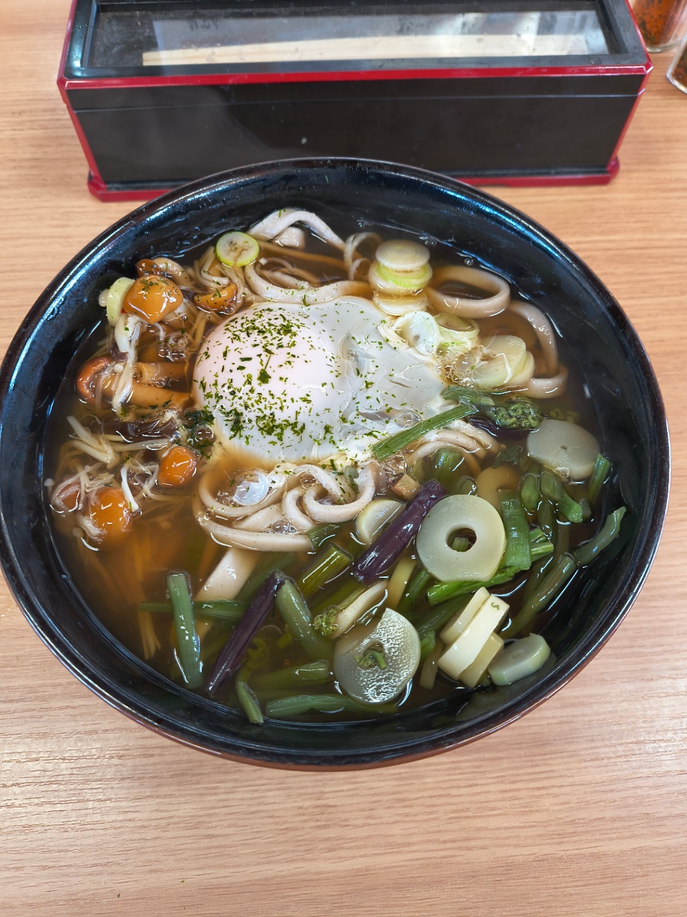 月見そば頼んだけどデフォルトで山菜となめこが入ってて