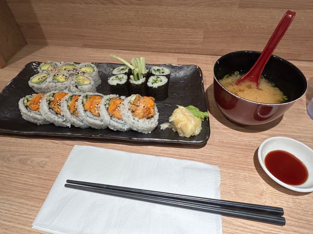 ・図書館でゆっくりした後、ガスタウンのお寿司屋さんへ ベジタブル寿司のコンボを頼んでみました かっぱ巻きと、アボカドロール、あとはヤムロール(ヤム芋が入っているらしい)、お味噌汁つきで14ドル お寿司だと考えるとかなり不思議だけど、ふつうに美味しかったのを覚えている