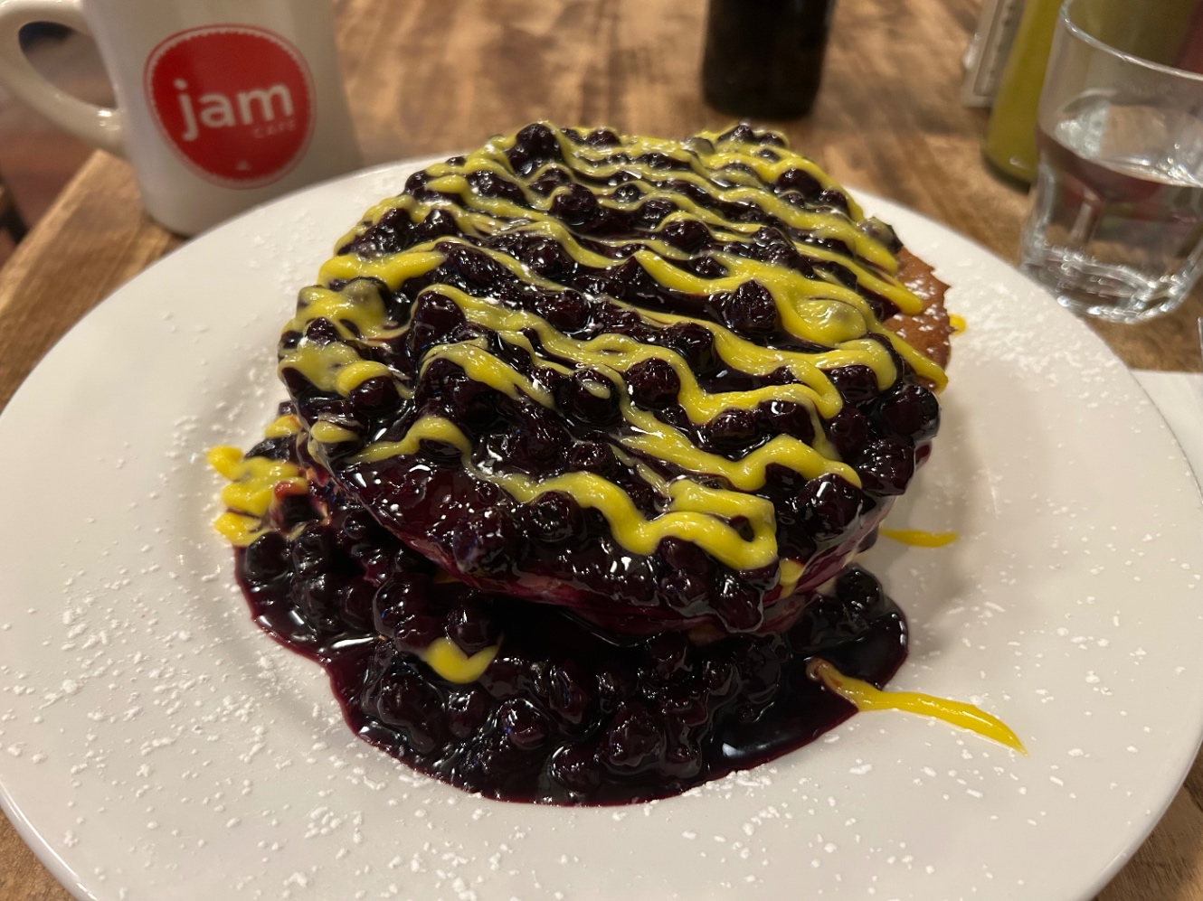 ・パンケーキ(ブルーベリーパンケーキだっけか)とホットチョコレートを注文 なんか思ってたよりもでかいし絵面もすごくてこれは…やばいぞ…となりながらも食べたら美味しかった
