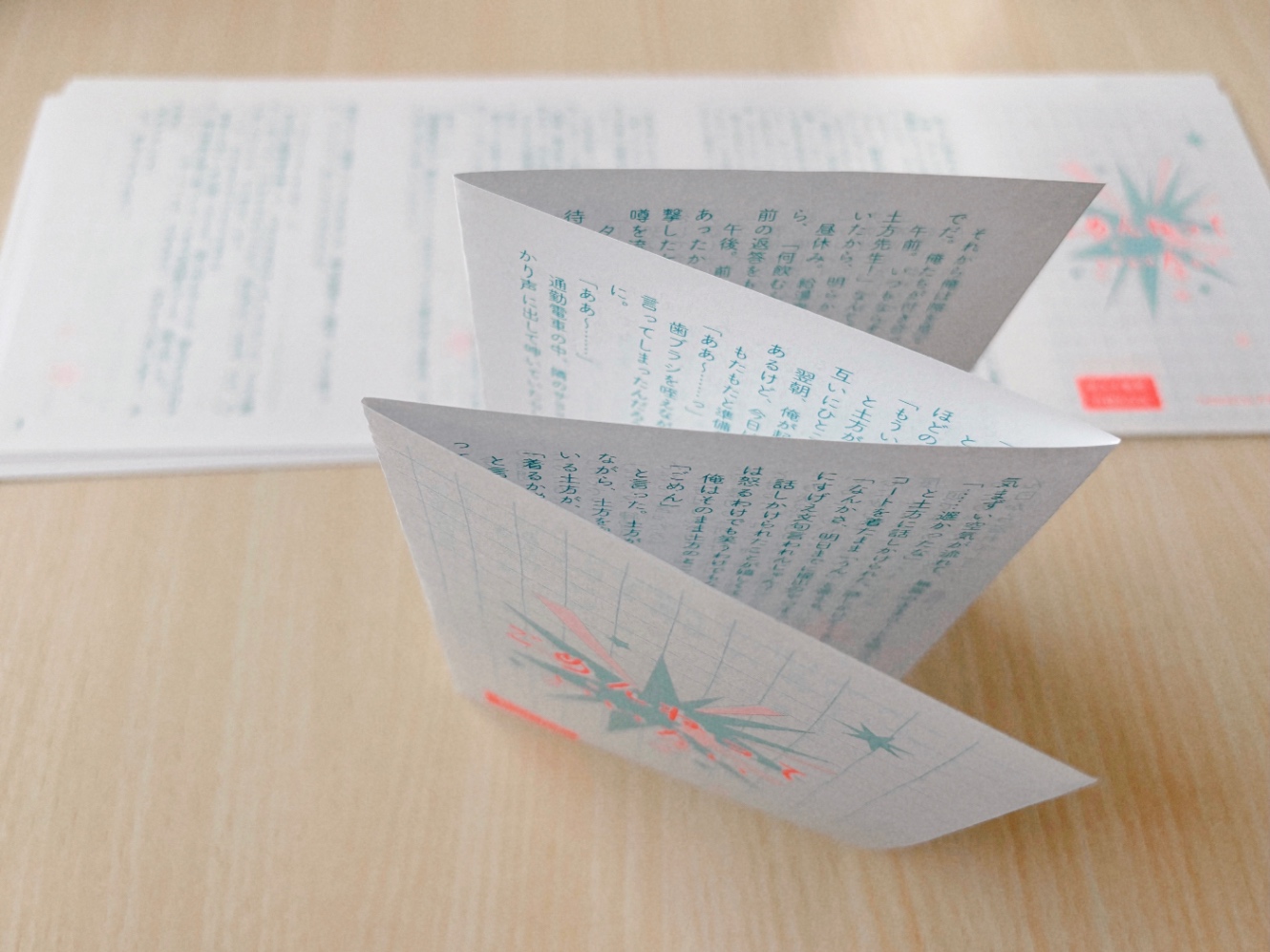 無配を折本にしようかな〜と考えていたとき、文庫8Pがちょうどいいなと思っていて(よく書くSSがこのくらい)、調べたらA3を折ってA6にするのが一番ポピュラーなやり方ぽかったのですが、折るのはともかく切る余裕あるか……?となってしまい……。あとA3を折るやり方だと白紙部分が気になるなと思ってしまって、A4ながに表裏印刷して折りました。全部で3回折るんですが全てフチに沿って折るだけなので不器用でもできる。簡単。もしまた無配折本作ることがあればこれがいいなと思ってます。読む順番ですこし混乱させてしまうかもですが、ページ番号ふれば問題ない。はず。
