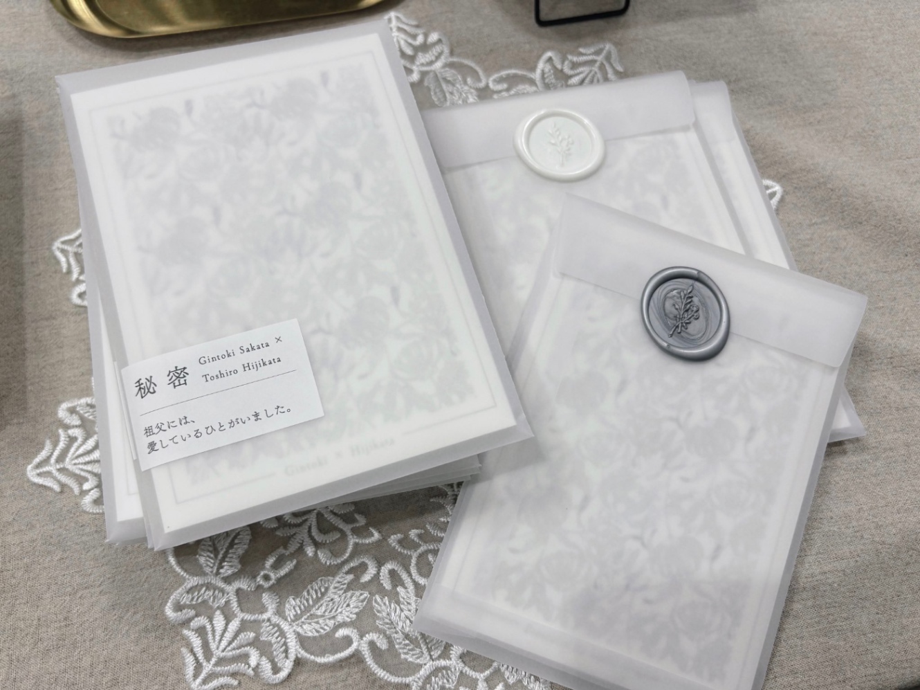 読む前に「秘密をひらく」という動きをしてほしかったので封筒に入れました。透けている封筒を使った理由は、うっすらと見えてしまう隠し切れない気持ちをイメージしています。なんて書きましたが、トレペがかわいいから、という理由が半分くらいあります。トレペ大好き。