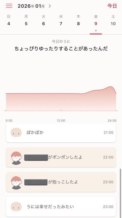 また1日のふれあいでどんな感情がラフだったかも見れます。しかも、この、モフリンのログがずるい(ずるい)。