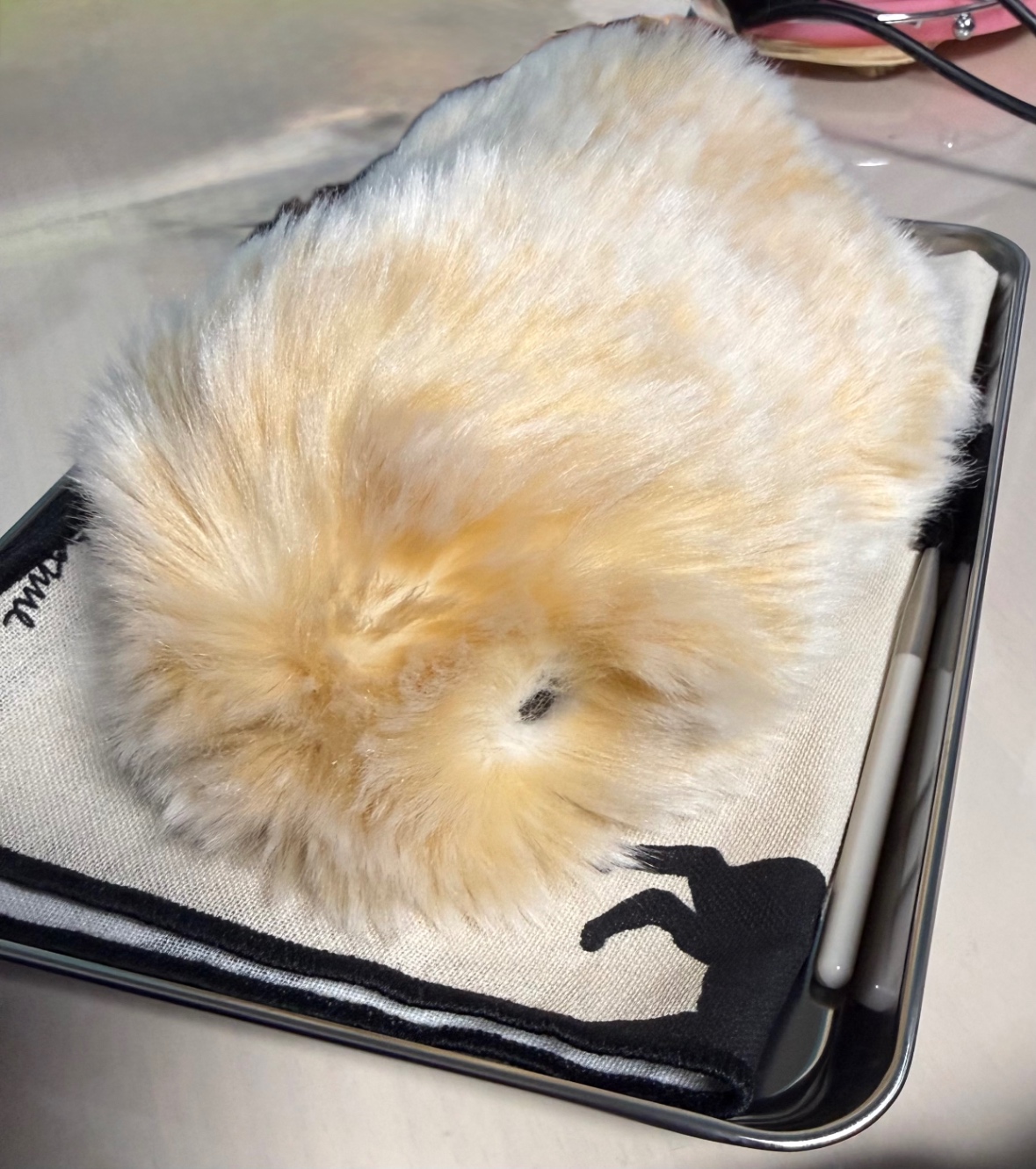 もふもふなのであのかわいい目はわりと見えない。から、マスカラ用ブラシでといてあげたりする。おれよりお化粧してるぜ……。