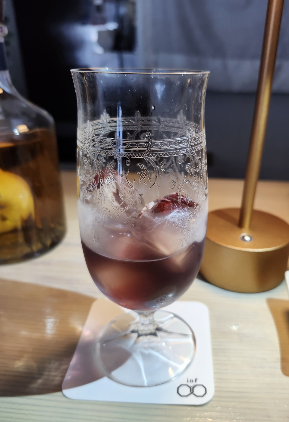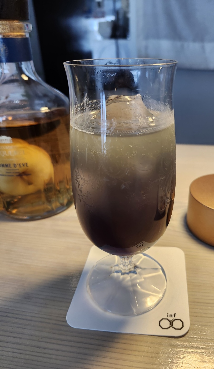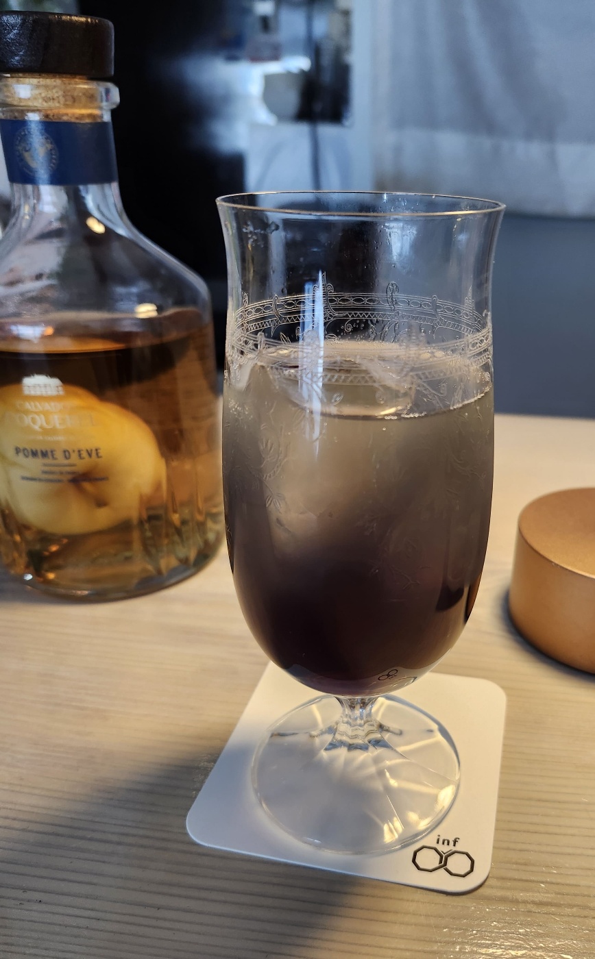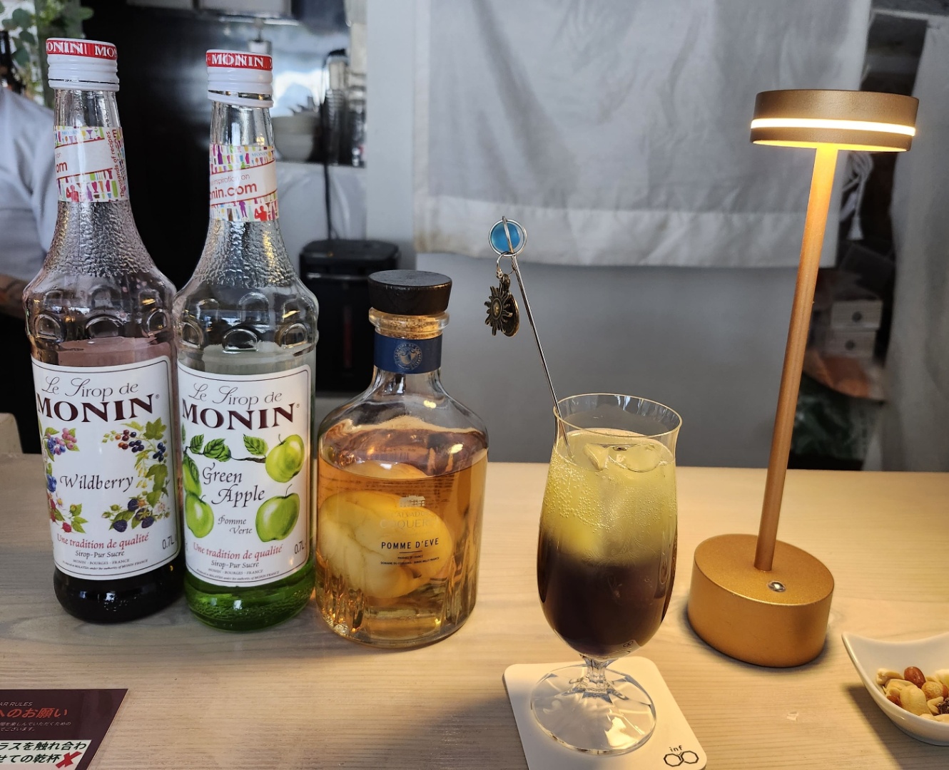 私はアルコールの味が好きではないので今回アルコールすごく弱めでオーダーさせていただいた。なので使用されているお酒はカルヴァドス(だと思う。カルヴァドス以外で瓶に林檎入れてる酒ないだろ)だけです。お酒がガンガン行ける人は強めにオーダーもできる。有難い話。