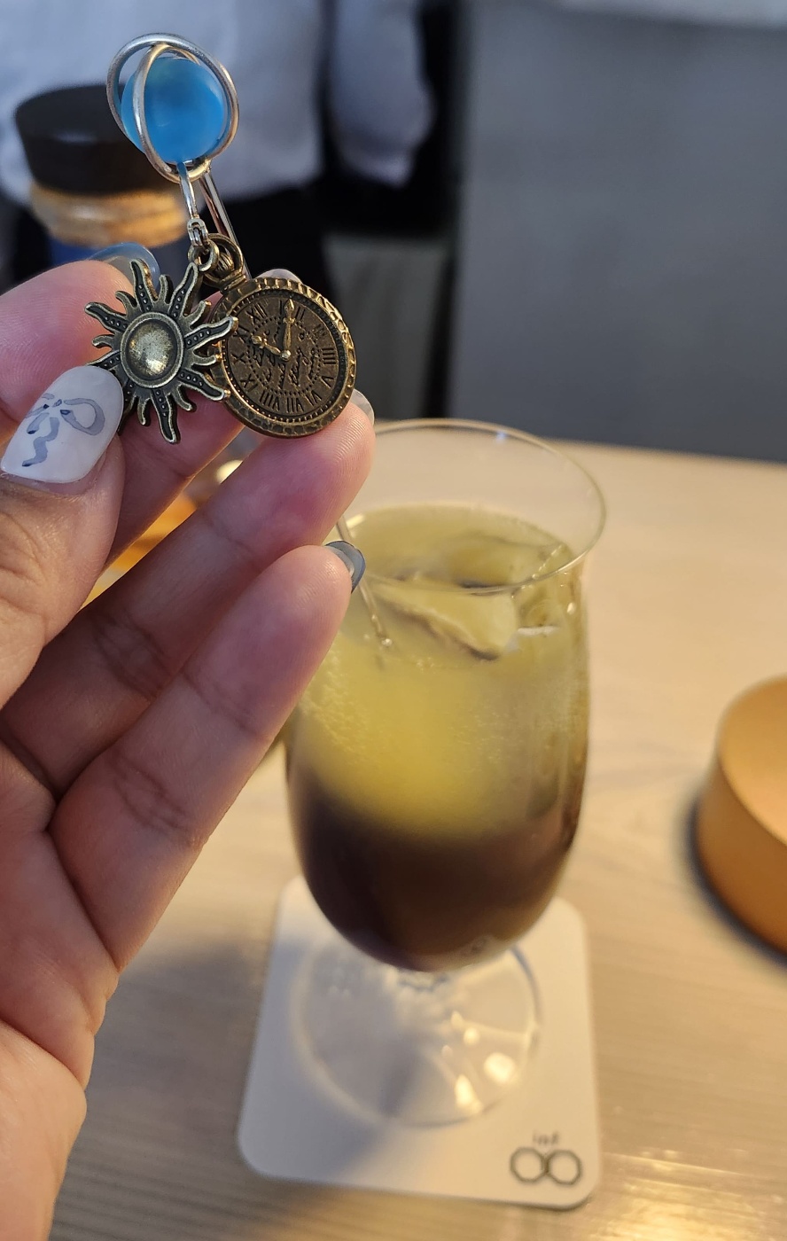 上はオレンジジュースでカルヴァドスを割ったのがフローティングされていて、下は黒っぽいシロップを紅茶で割ったやつだ。カルヴァドスの味でフラットくんの何を考えてるか分からない感を表現しつつ、オレンジジュースで割ったことで酸味と甘みが足されて明るさや人助けが出来る優しさなどを表現しているらしい。バーテンダーさんの解説は録音できないのでこれは記憶で書いている。当然オタクなので「待って!」を連発したいのだが、待ってくれるシステムはない。推しカプを自分の解釈を更にカクテルで再表現される衝撃と喜びを享受せよ。
